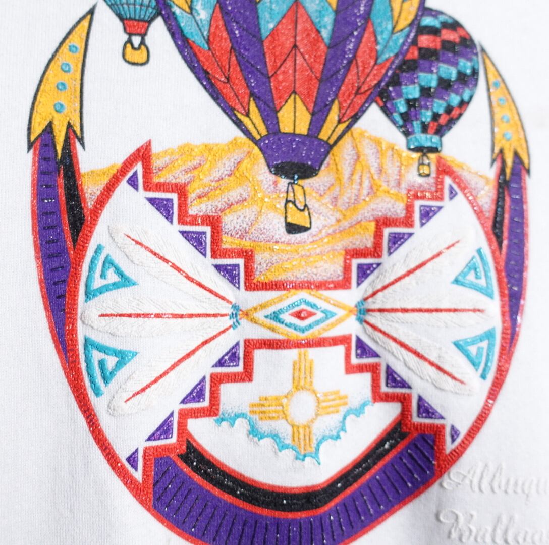 ホワイトをベースに、カラフルな気球とネイティブ調のフェザーなどのプリントをあしらったデザイン。