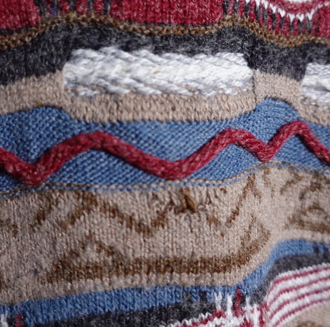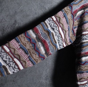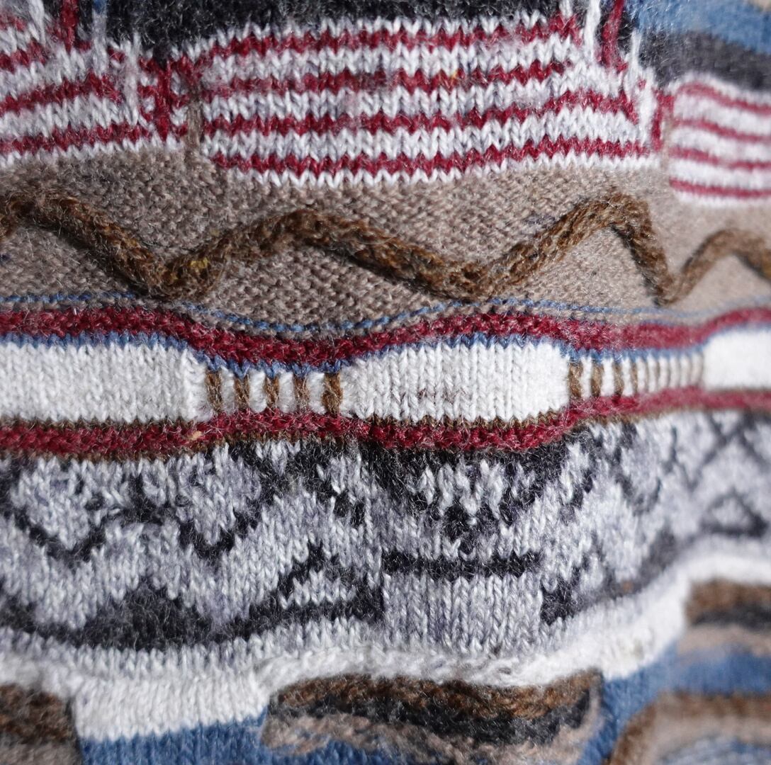 カラーごとの柄や様々なニッティングをボーダ状にあしらった立体感のある3Dデザイン。