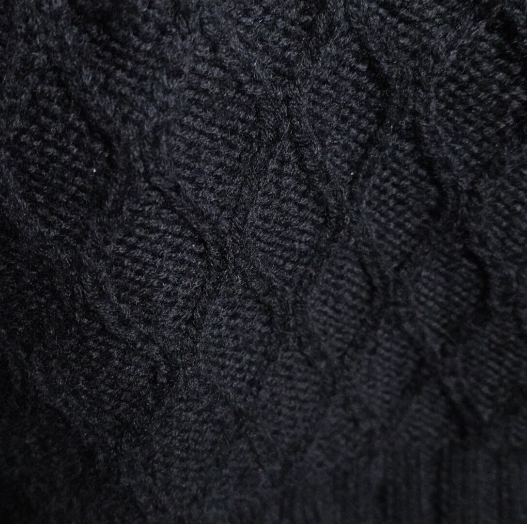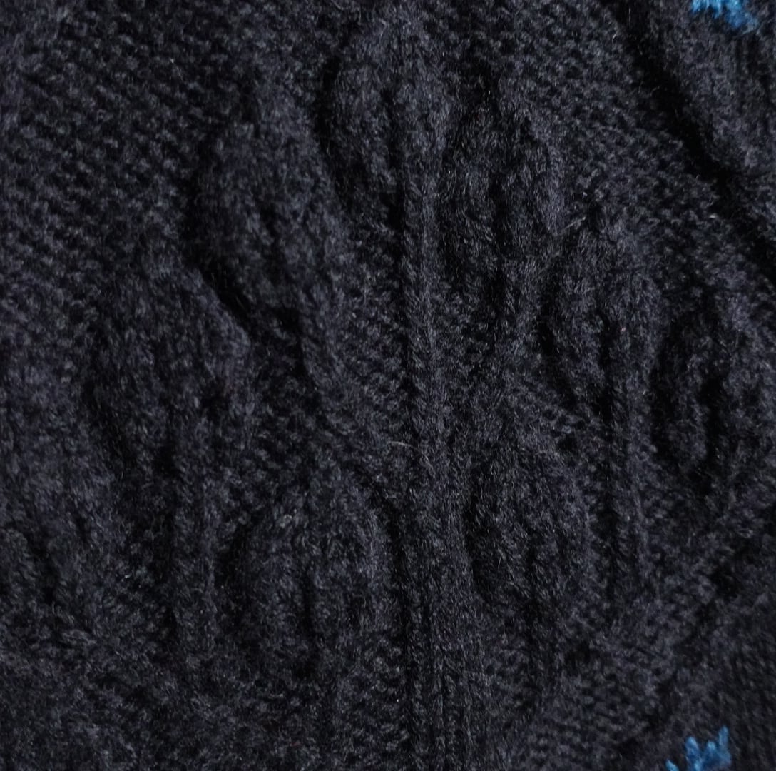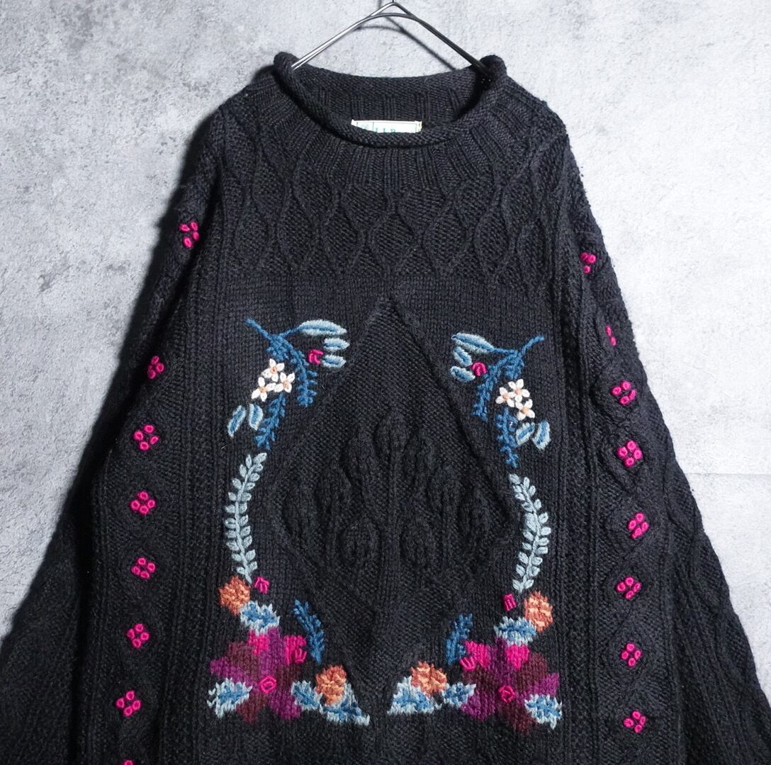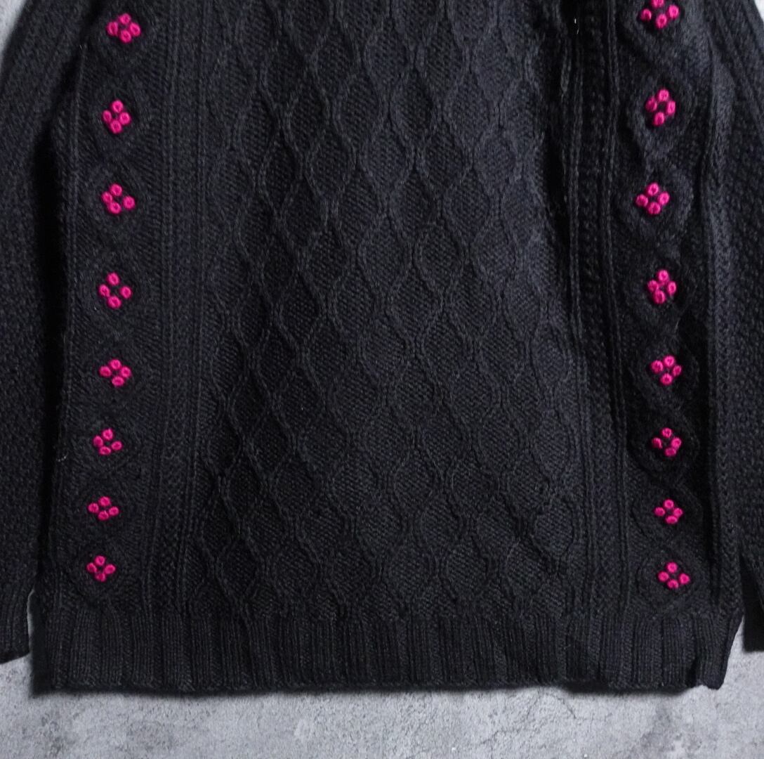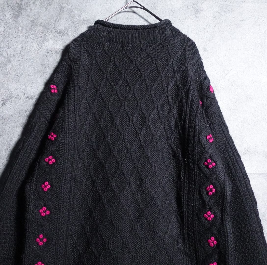 ブラックの様々な編み方をした立体感のあるケーブルニットをベースに中央に色鮮やかなフラワーモチーフをあしらった凝ったデザイン。