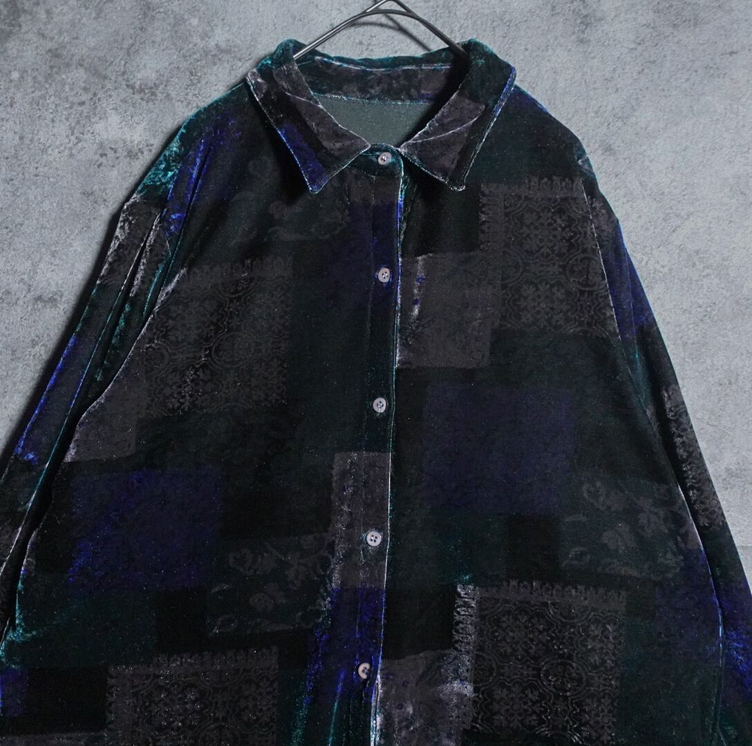 ブラックをベースにグリーン、ブルー、グレーのカラーごとの抽象柄とボタニカル柄をあしらったパネルをバラバラに全面にあしらったアーティスティックなデザイン。