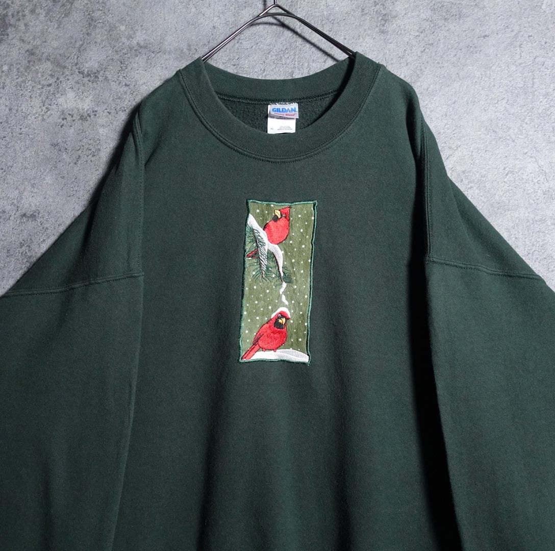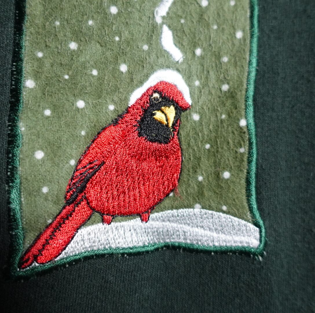 グリーンをベースに雪が被った木に佇む鳥と雪を被った赤い鳥を刺繍で表現した冬らしいデザイン。
