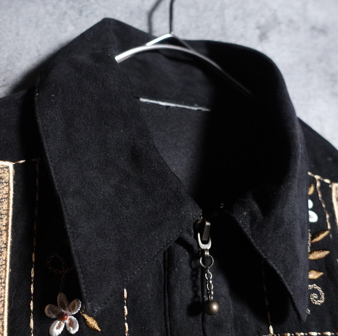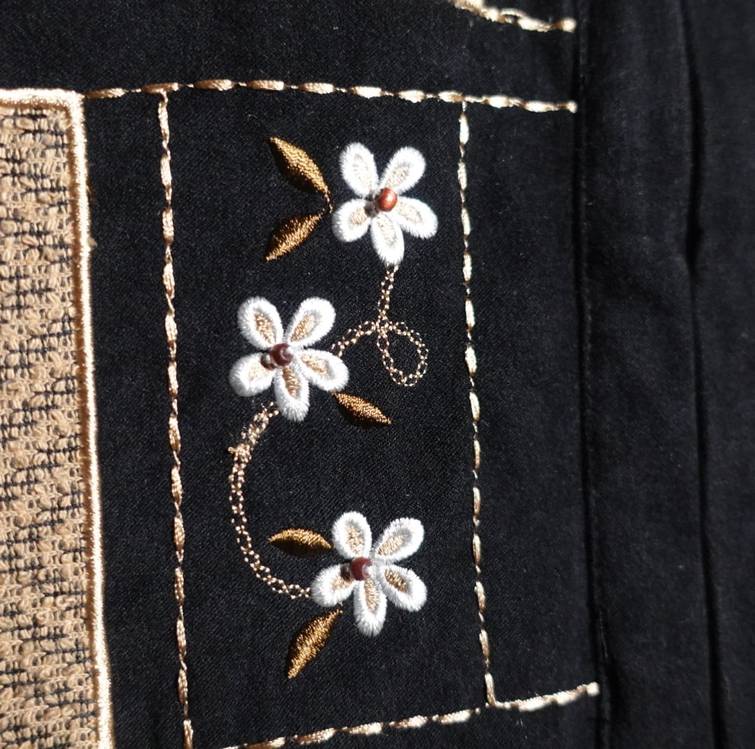 ブラックをベースに前面に3種類のフラワーモチーフの刺繍と2種類のゴブラン生地を左右対称に施したスペシャルなデザイン。