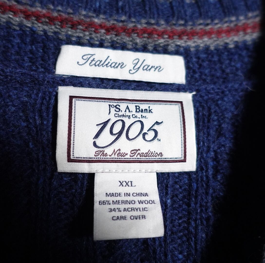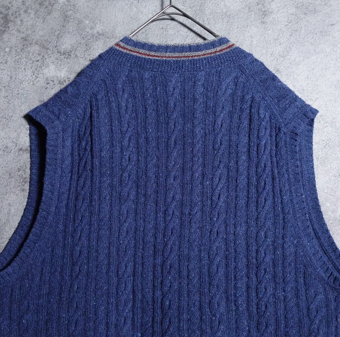 ブルーの立体感のあるケーブルニットをベースにネック部分にグレーとレッドのラインをあしらったチルデンデザイン。