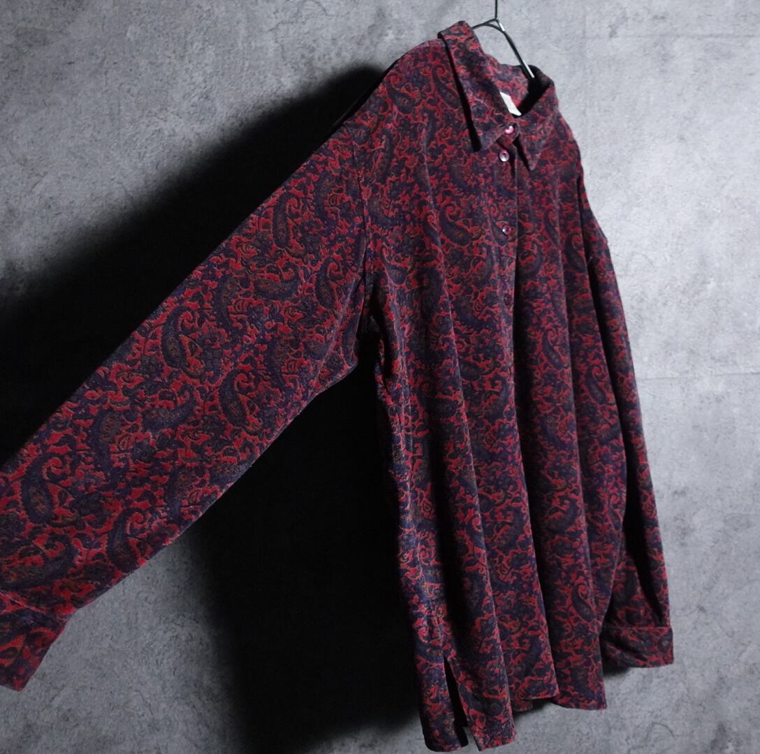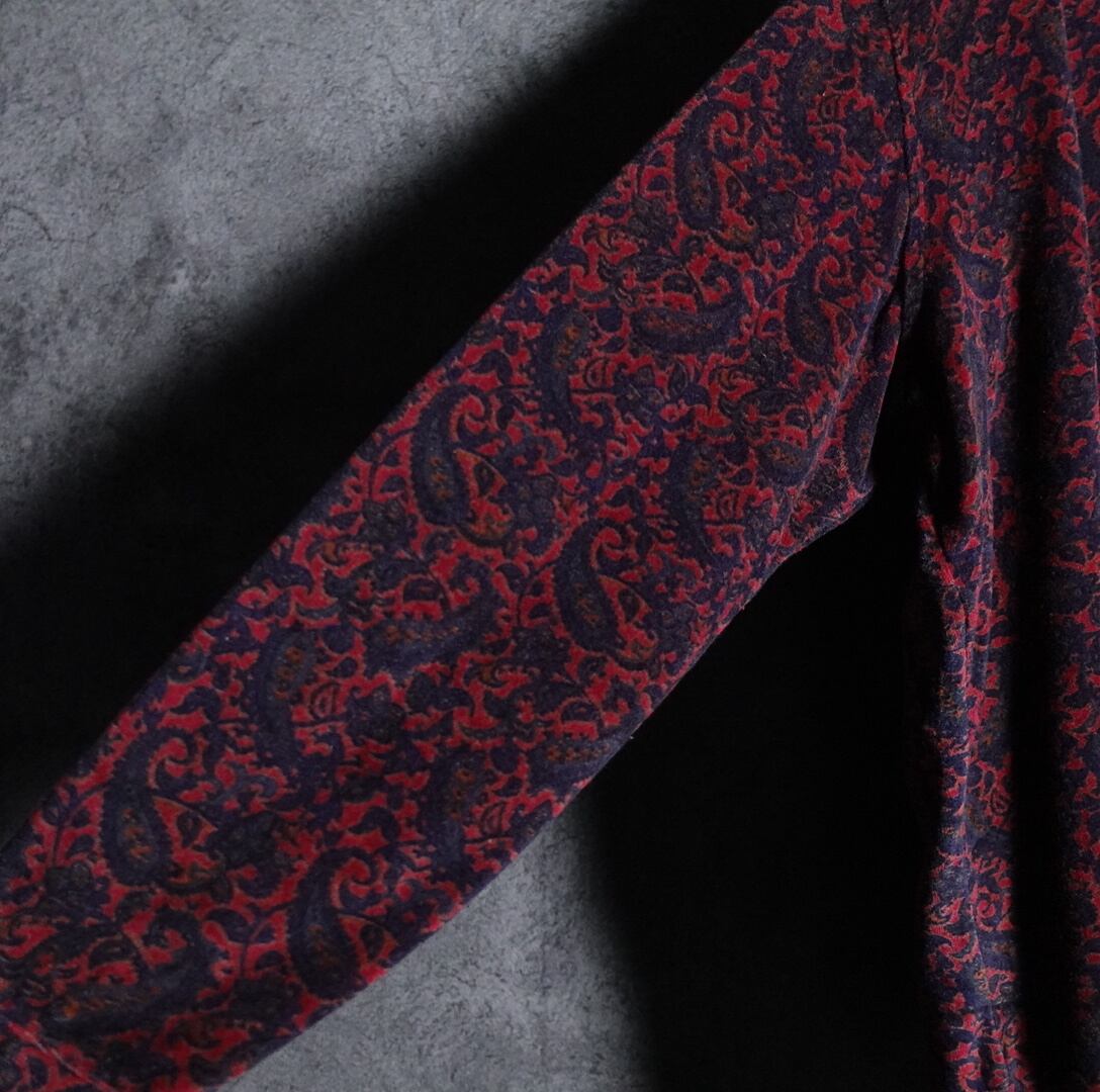 ワインレッドをベースにブラック、ブラウンのペイズリー柄を前面にあしらったモードなデザイン。