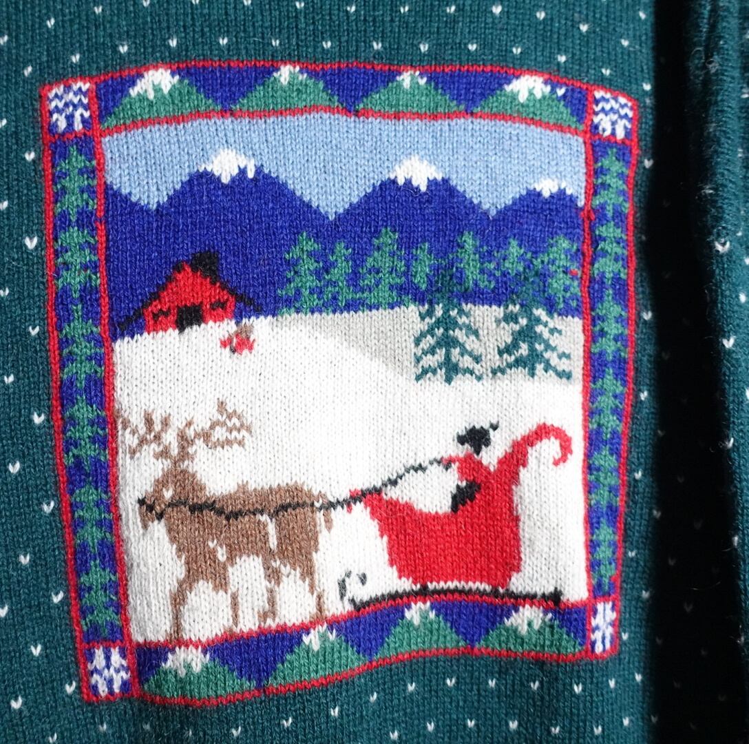 グリーンとホワイトのバーズアイ柄をベースに、トナカイがソリを引っ張っている様子の風景画を、前面の中心にあしらったデザイン。