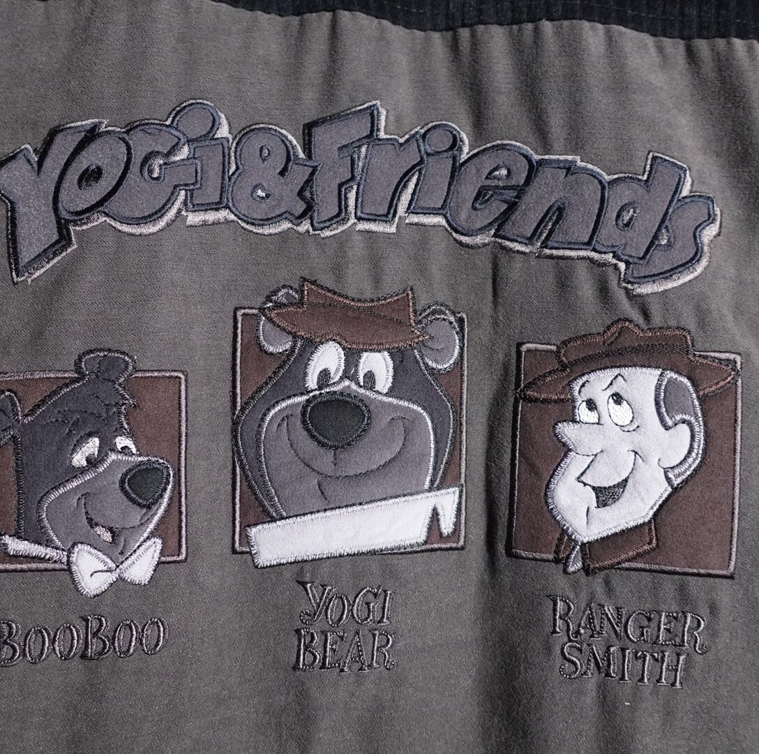 ブラック×グレーをベースに両面にクマや人のキャラクターを別生地と刺繍で施し表現した凝ったデザイン。