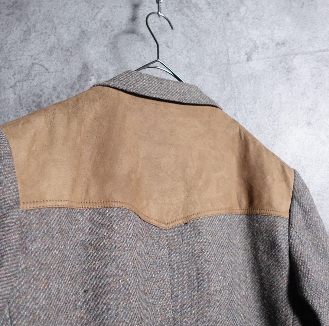 グレーに様々な色の糸が編み込まれたツイード生地をベースに、ウエスタンシャツの特徴的なディテールの1つの逆三角形のウエスタンヨークをフェイクスエード生地で施したデザイン。