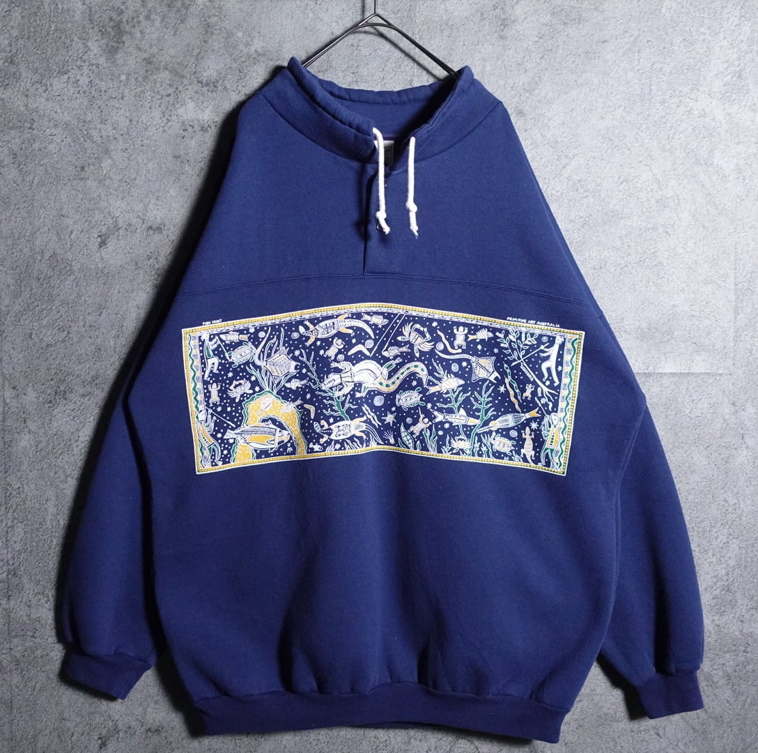 ブルーをベースに中央にイエロー、グリーン、ホワイトで表現された様々な海の生物達を四隅にいる人間が狩る様子をあしらったアーティスティックなデザイン。