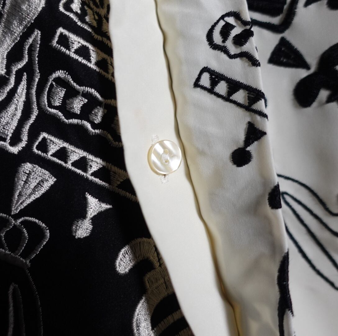 フロントと襟先に幾何学的なモチーフを全て刺繍で表現した凝りに凝ったインパクトのあるデザイン。