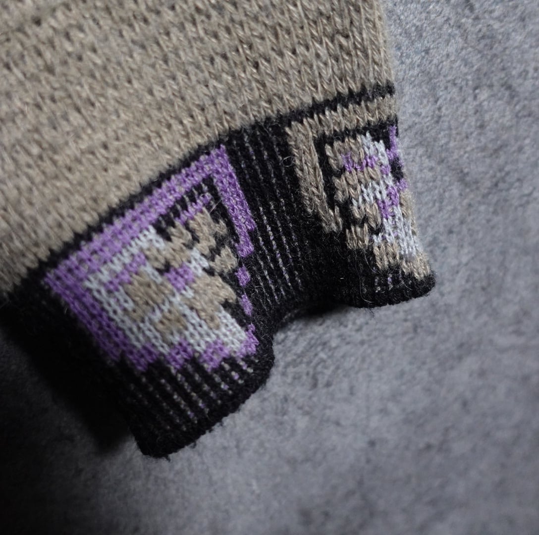 袖先、裾がブラック、パープル、ベージュの小さなモチーフをあしらっており、洒落たアクセントになっています。