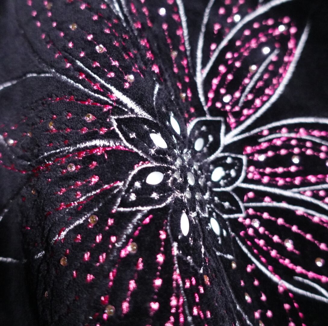 ブラックをベースにフホワイトとピンクのフラワーモチーフ刺繍を大きく施したデザイン。