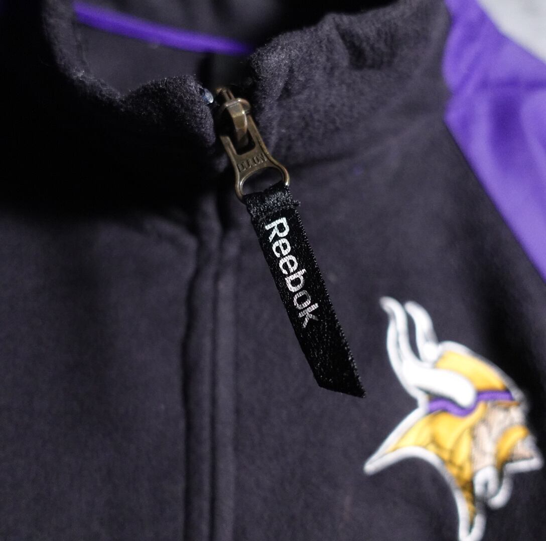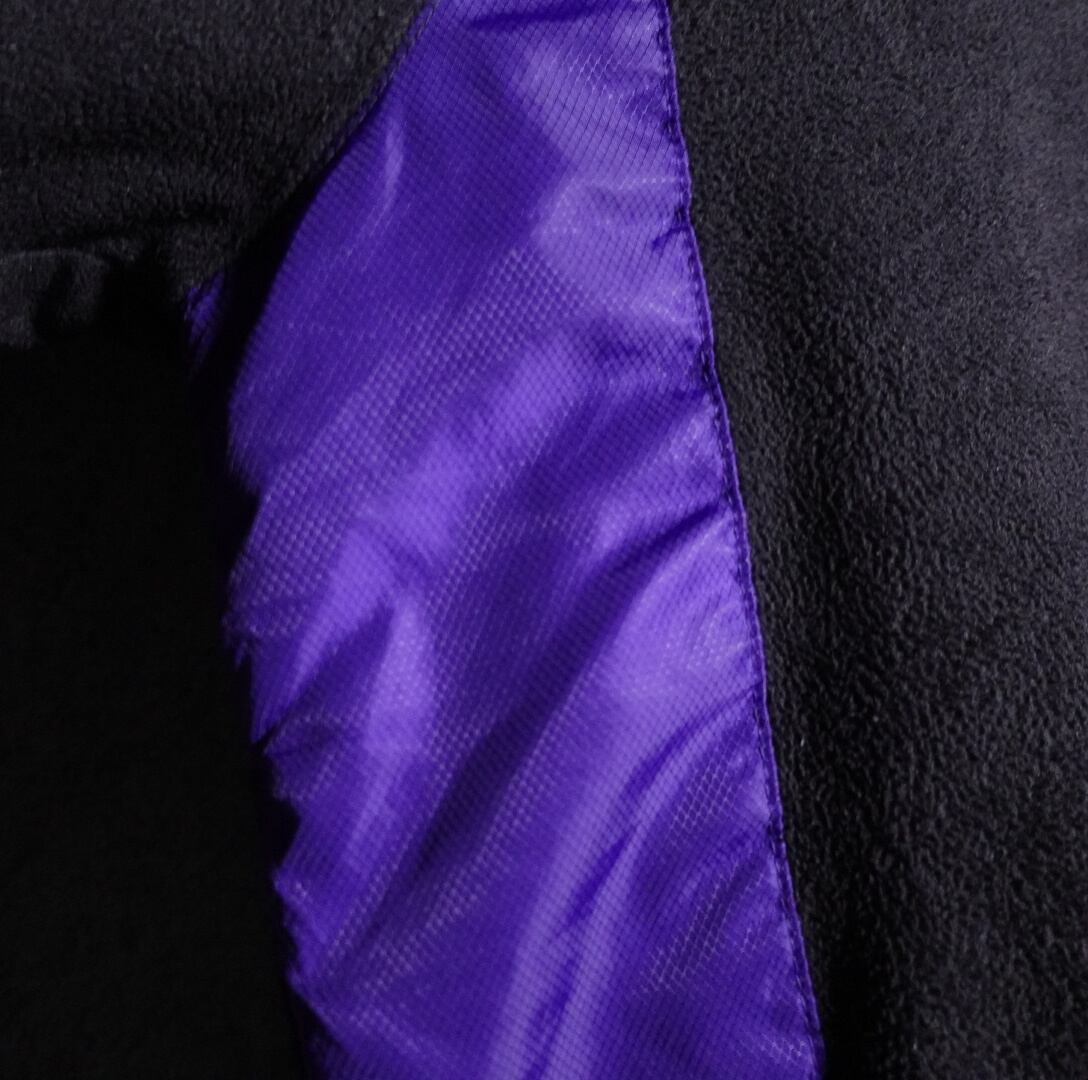 ブラックをベースに襟から肩、脇下にかけてパープルのナイロン生地に切り替え、左胸にNFLチームのミネソタ・バイキングスのロゴ刺繍を施したデザイン。