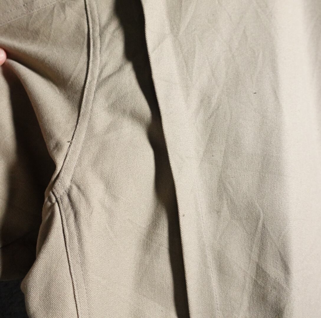 ベージュをベースに前面に斜めのジップポケットと大きなフラップ付きのポケットを施した近年人気のカバーオールライクなデザイン。