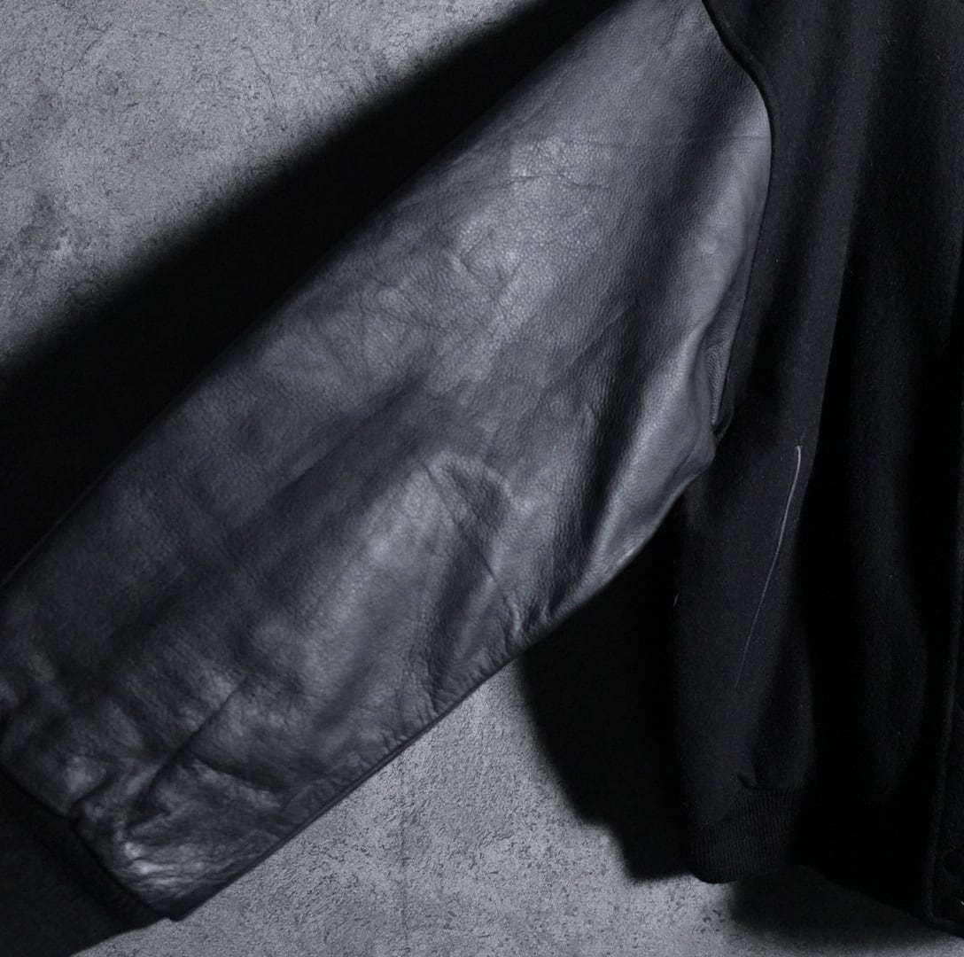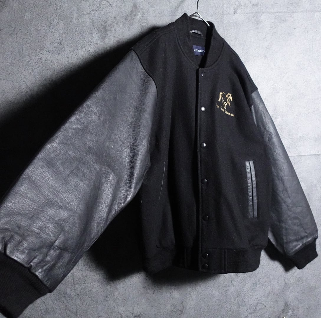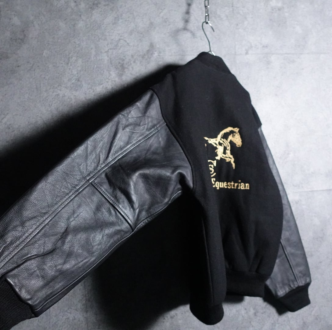 90s Black Melton x Leather Horse Embroidered Design Stadium Jacket