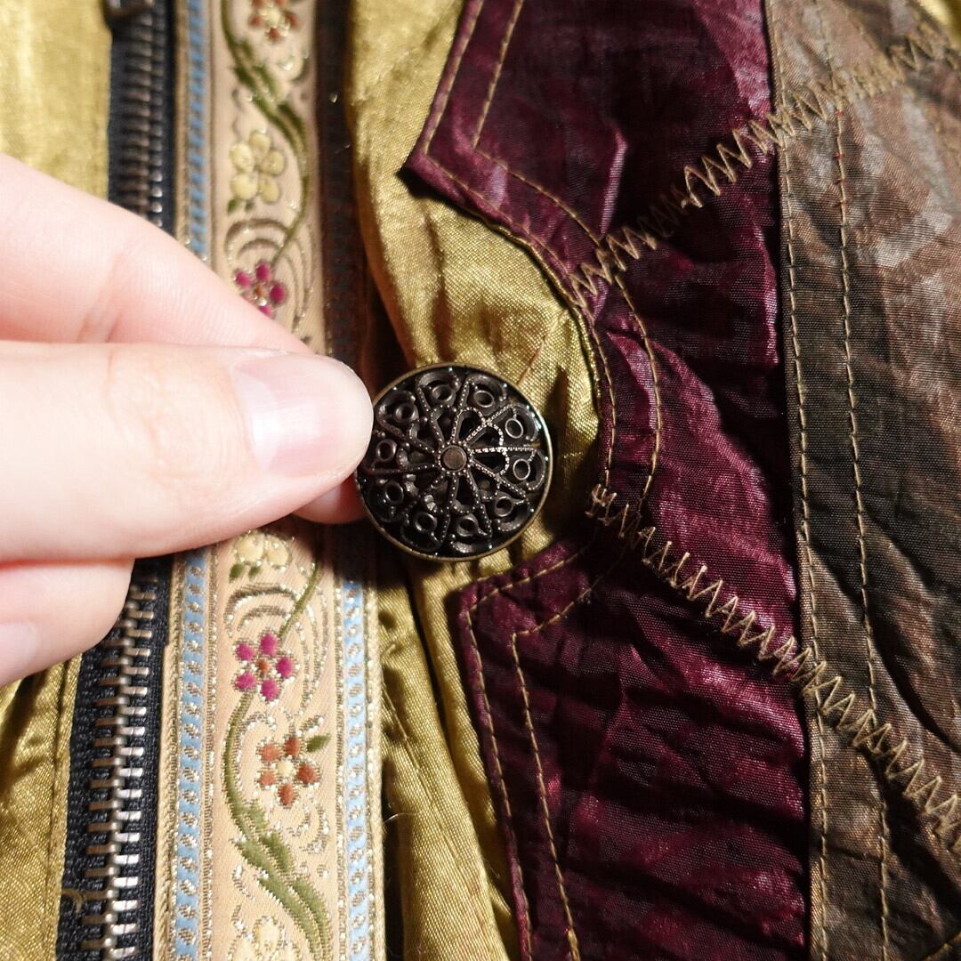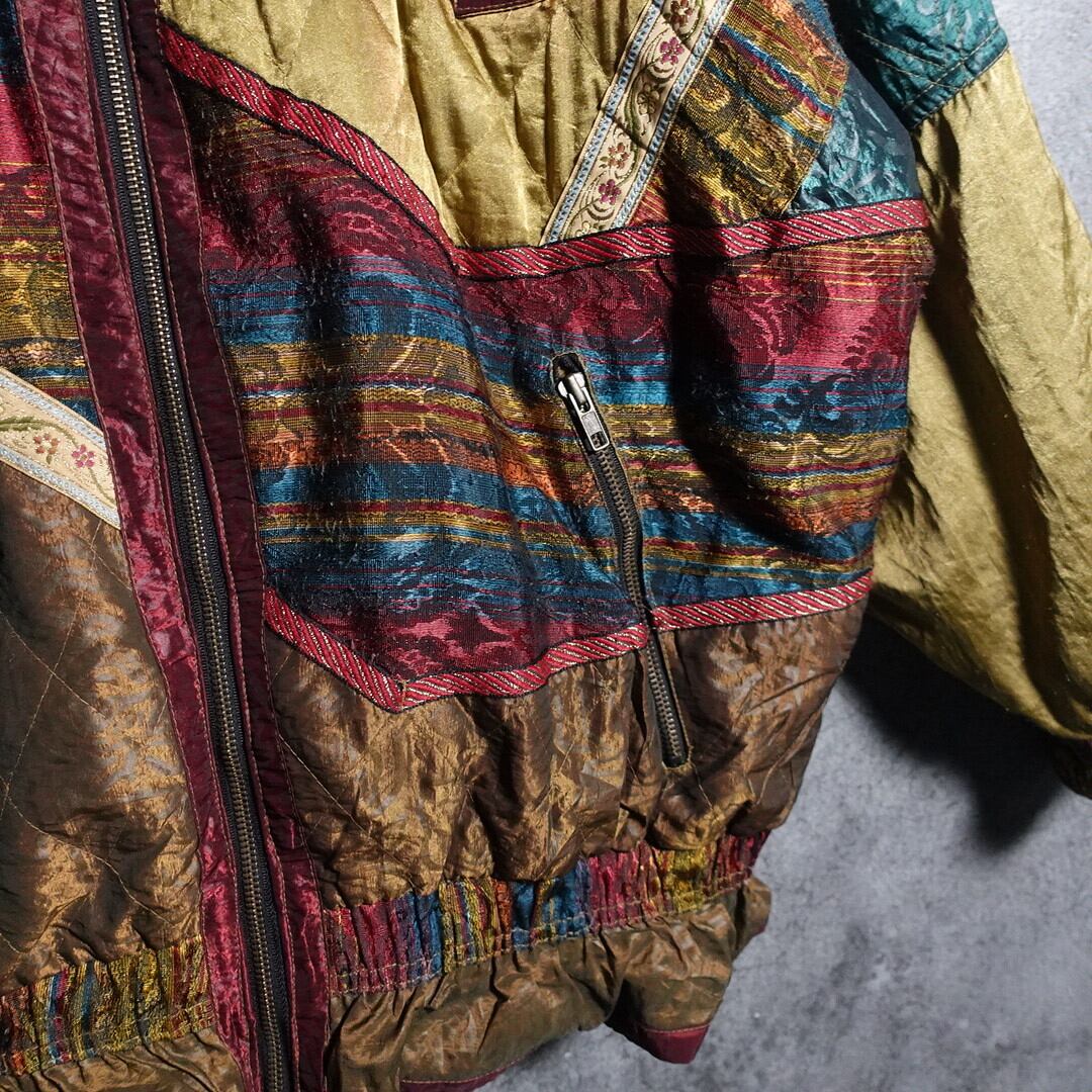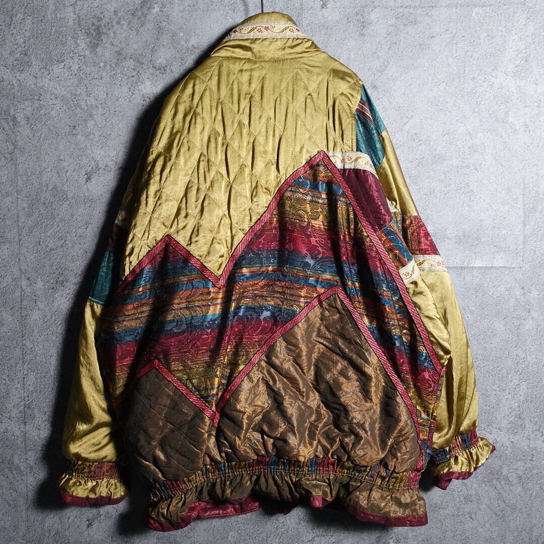 ゴールドをベースにワインレッド、ブルー、ブラウンのボーダー柄、花柄、キルティングの生地で切り替えた凝りに凝ったデザイン。