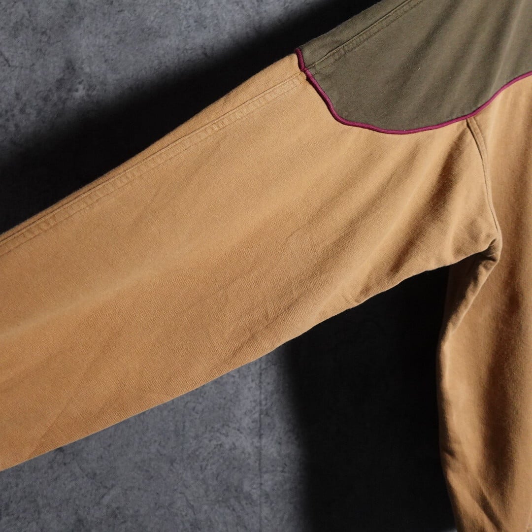 リブから袖にかけてカーキグリーンに切り替わっており、ワインレッドのハイピングが施された洒落た切替デザイン。