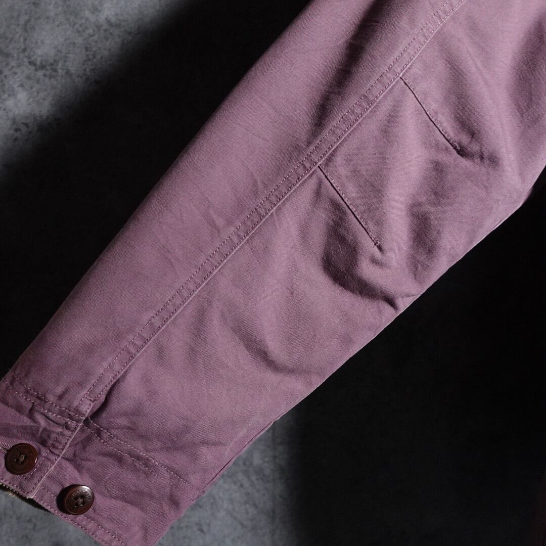 絶妙な色味の淡いパープルカラーをベースに前面に斜めのスラッシュポケットと大きなフラップ付きのポケットを施した近年人気のカバーオール。