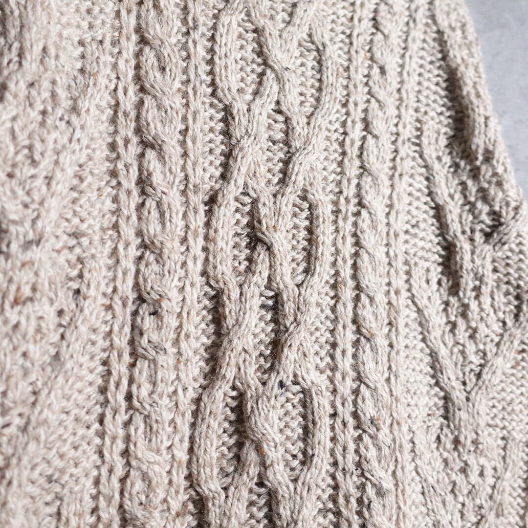 アイボリーをベースに、立体感のあるニッティングで表現された縄柄をあしらったフィッシャーマンニット特有のデザイン。