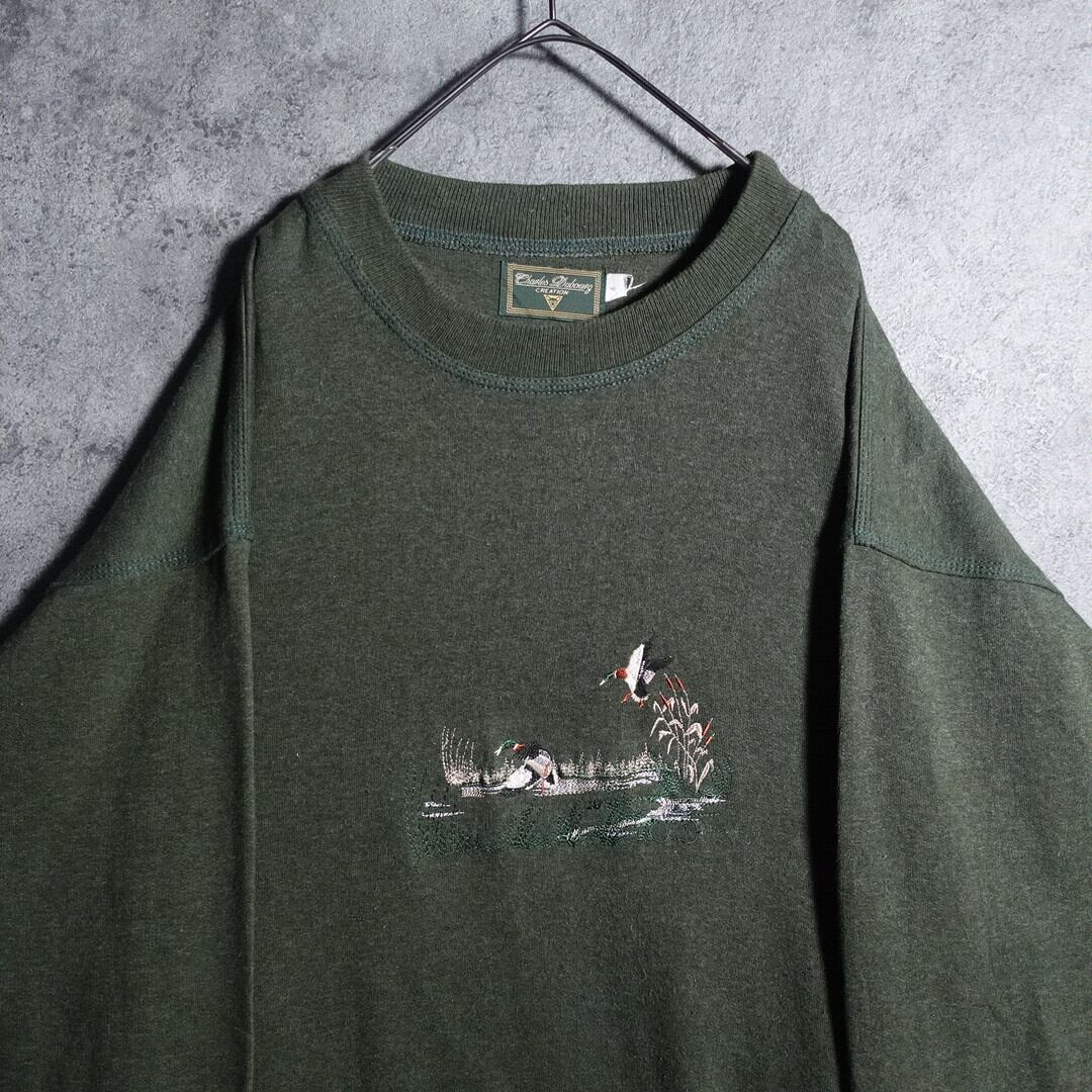 グリーンをベースに2羽のアヒルの刺繍を施したデザイン。