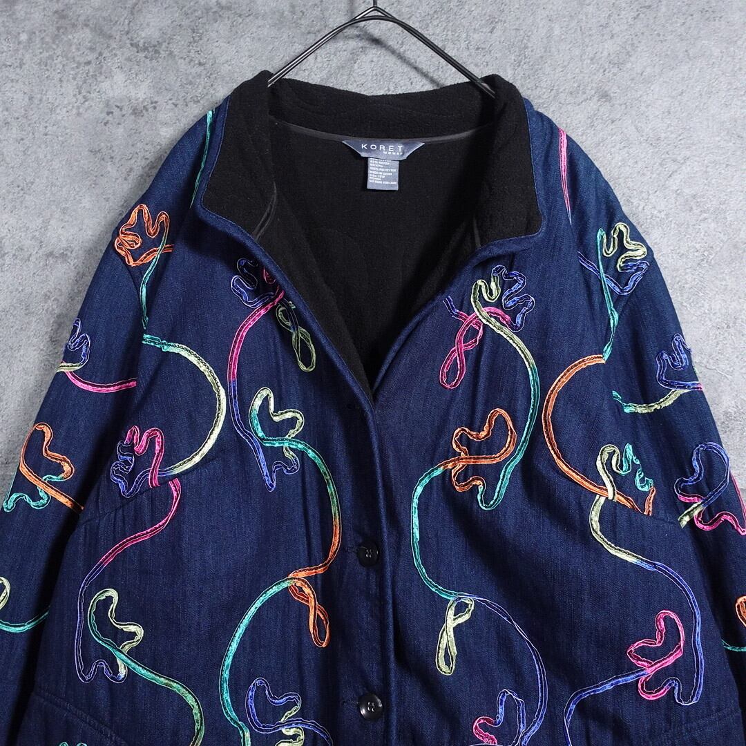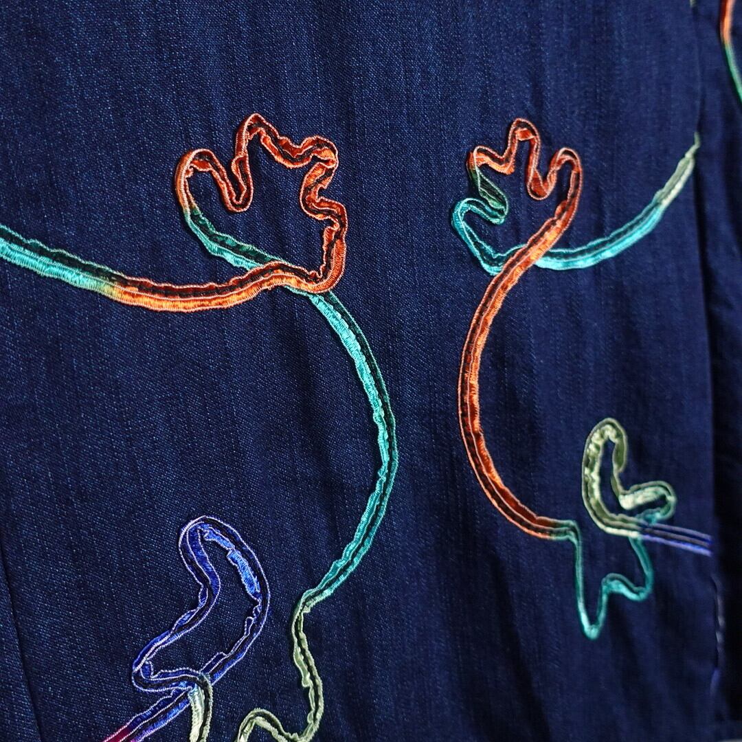 デニムをベースにオレンジ、ライトグリーン、イエロー、ピンクなどのグラデーションした太い糸を全面に施した珍しいスペシャルなデザイン。