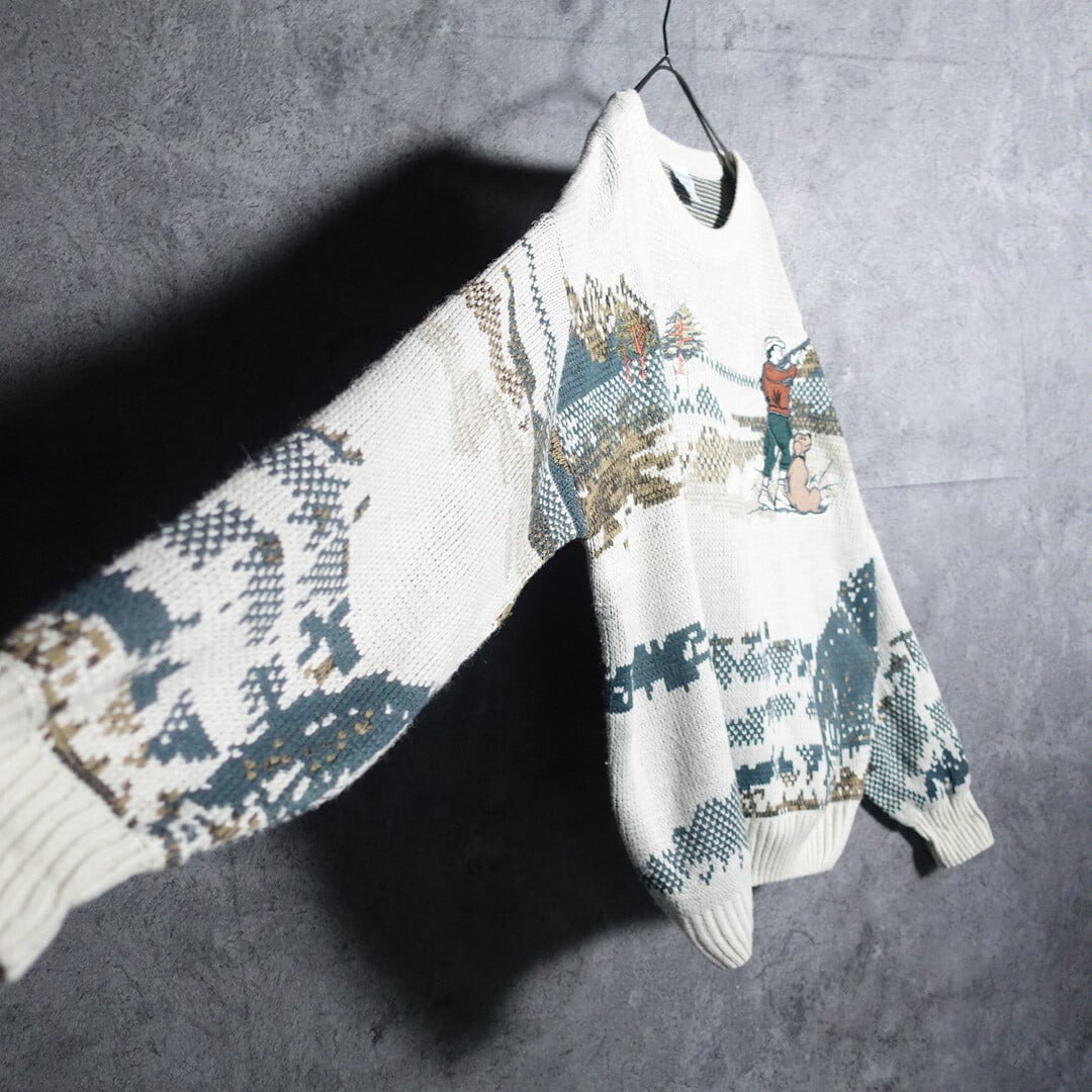 春先にぴったりのアイボリーをベースに森林を背景とした狩人と犬の風景を表現したデザイン。