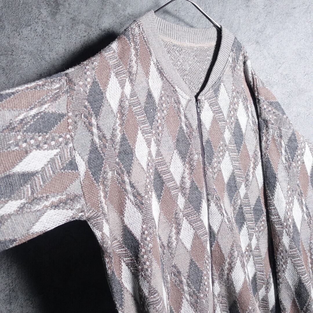 Multicolor diamond motif design zip knit blouson