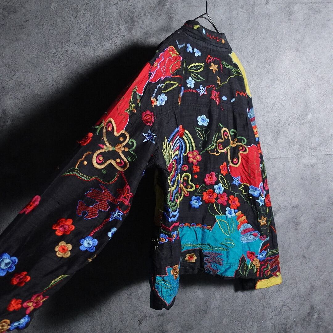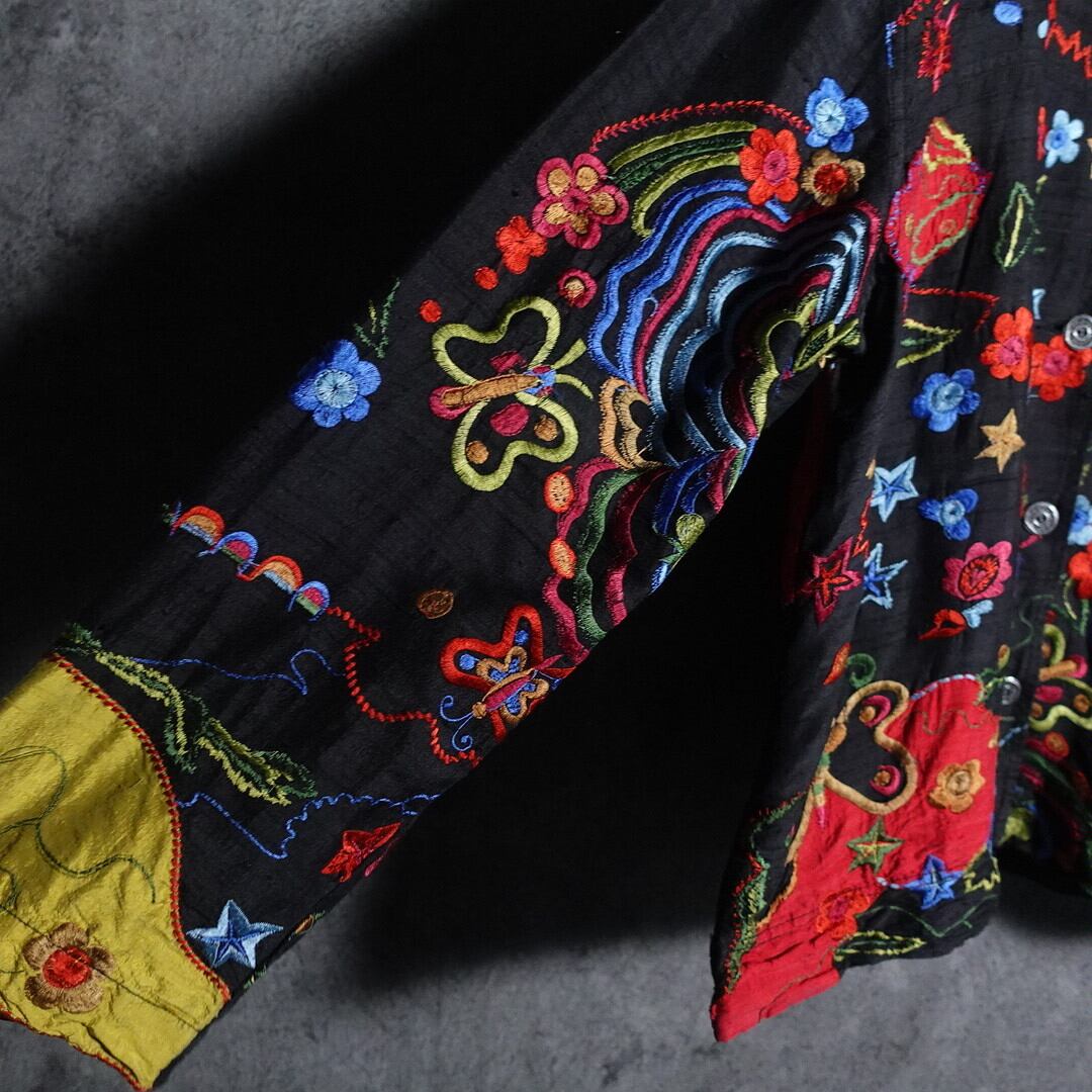 ブラックをベースに花、蝶、星、抽象などの様々なモチーフを全て刺繍で施した凝りに凝ったスペシャルなデザイン。