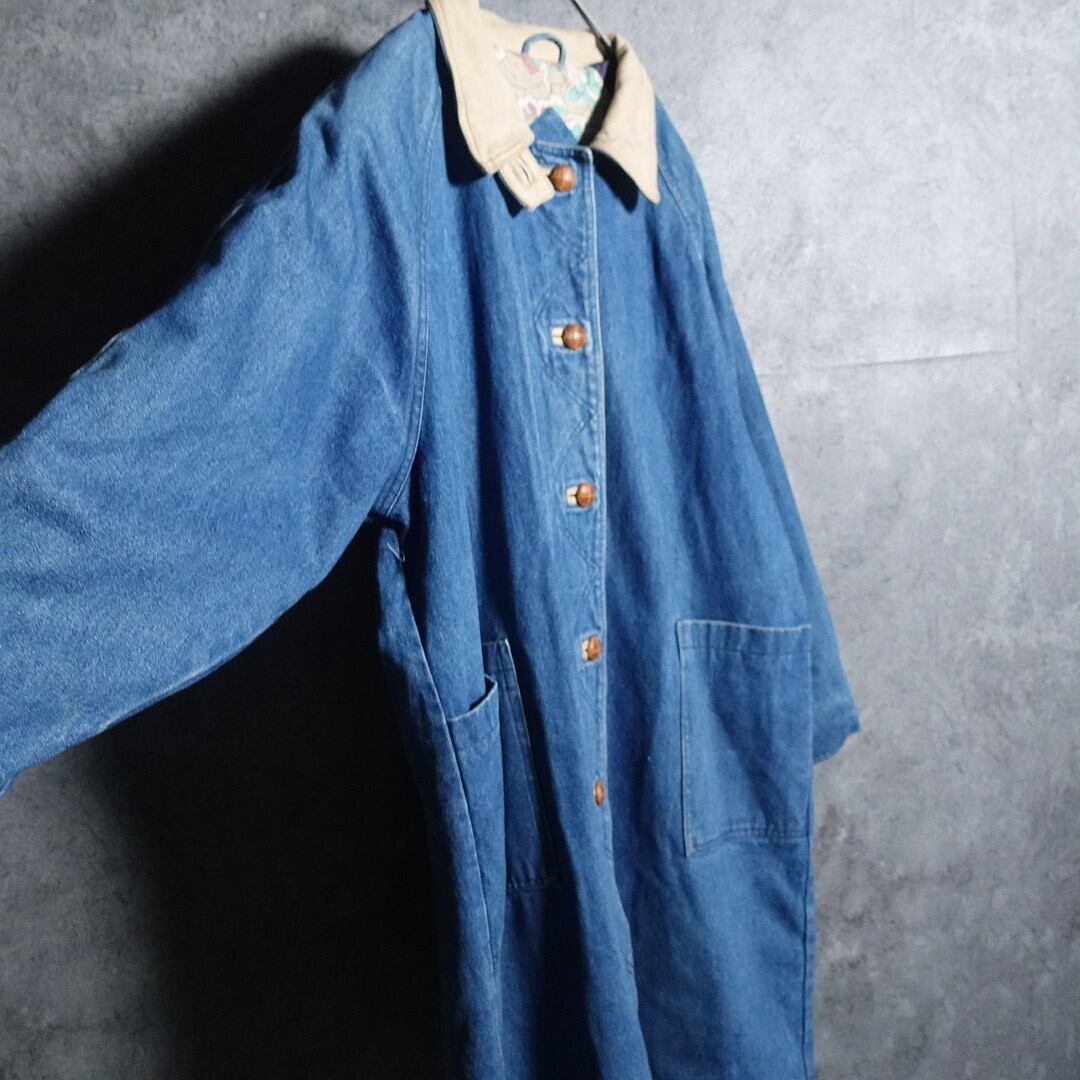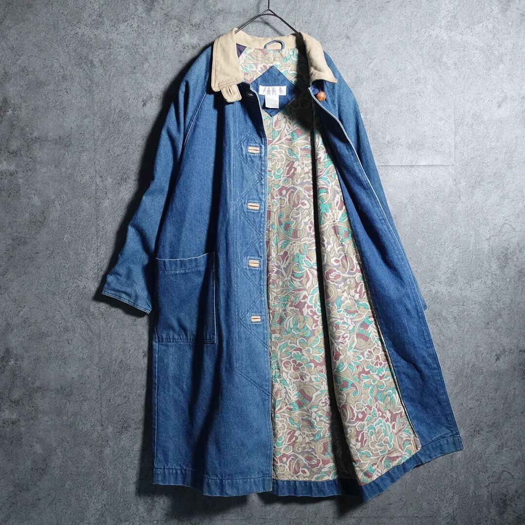Leather Collar Switching Botanical Pattern Denim Long Coat