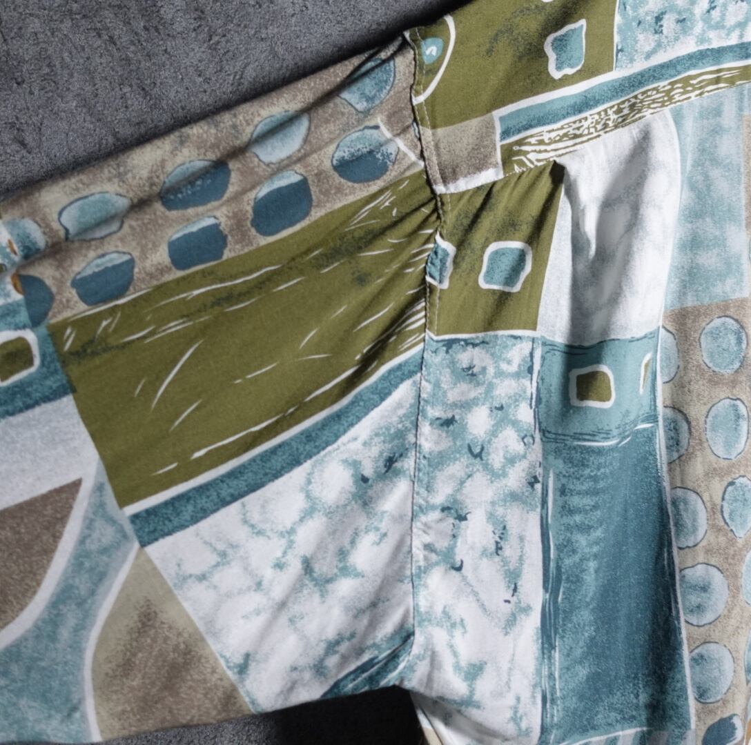 様々な幾何学模様のプリントを全面にバラバラにあしらったアーティスティックなデザイン。