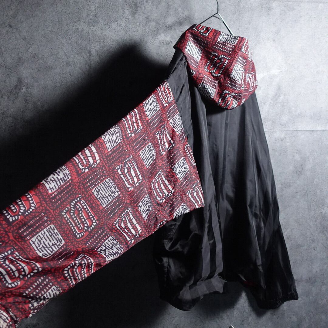 ブラックのシャドーの太いストライプをベースに左袖、フード、ポケットを抽象的な柄で切替た凝ったデザイン。