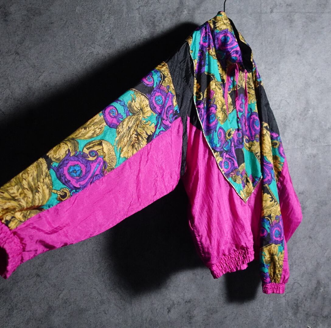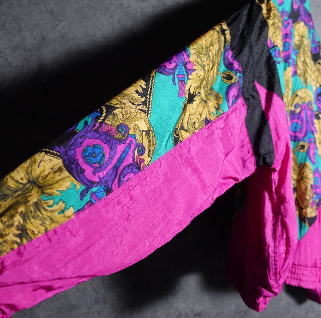 色鮮やかなピンクをベースに前後の見頃と袖にスカーフ調の柄をあしらったデザイン。