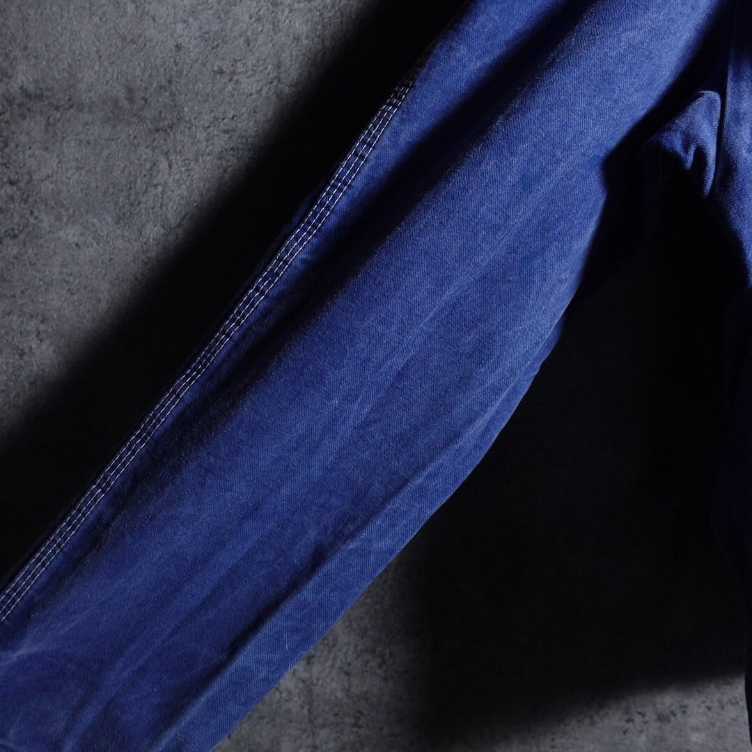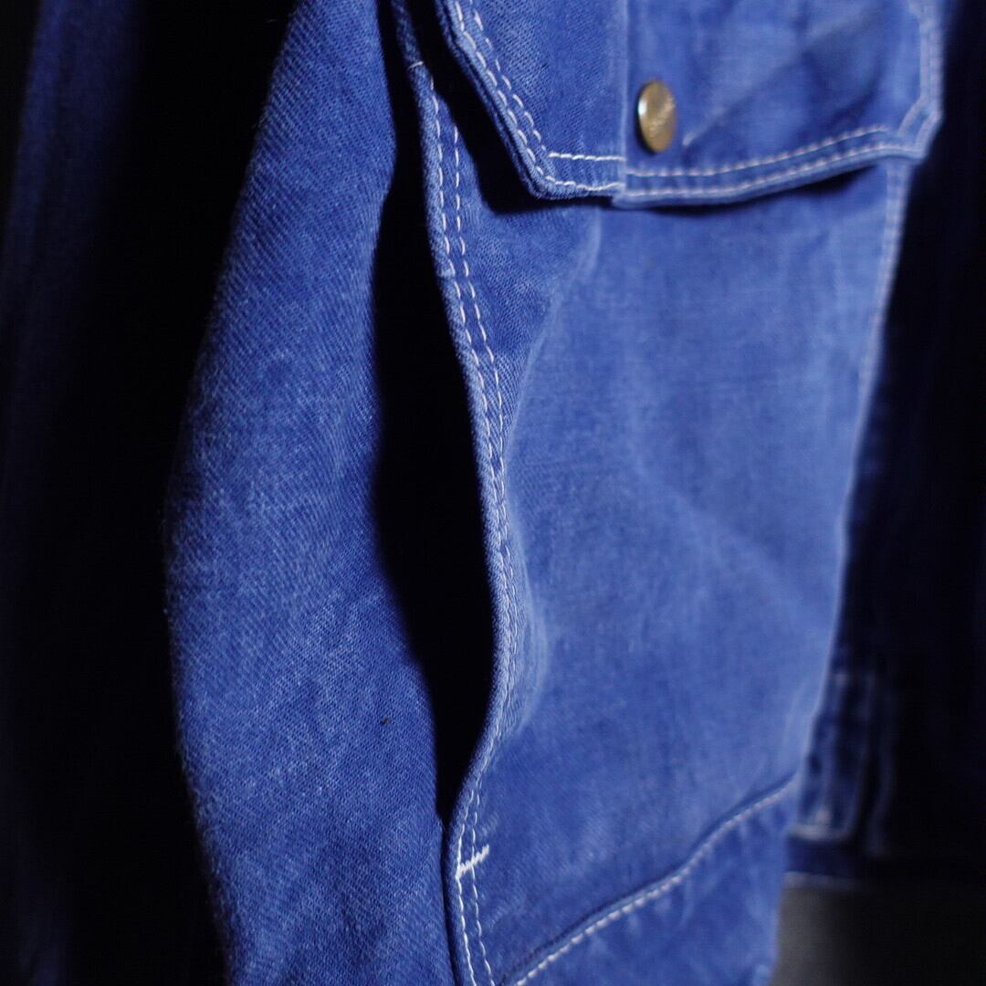 ワークらしいエイジングしたブルーコットンをベースに、フラップ&サイドポケット付きのポケットを施したデザイン。