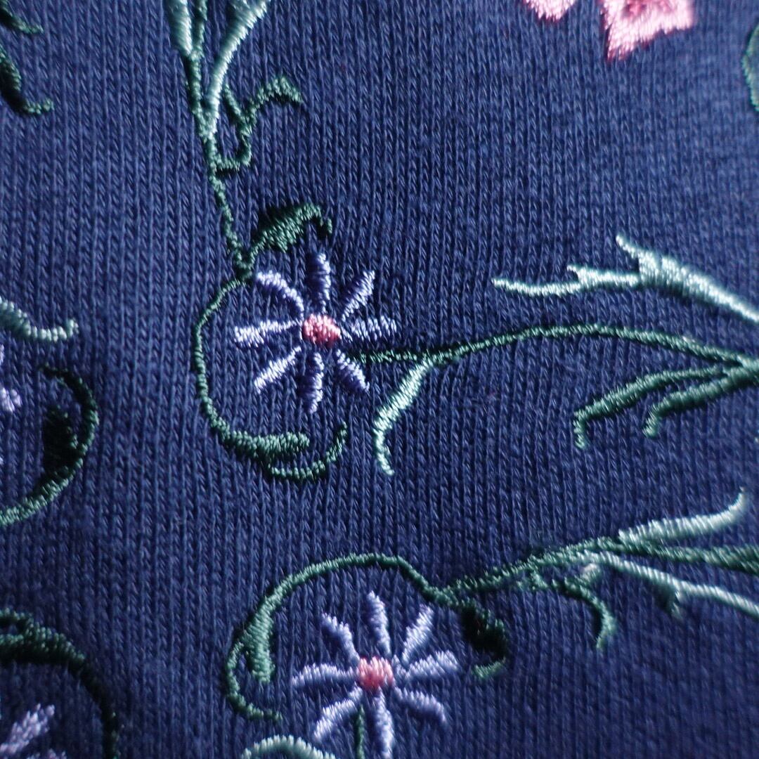 ネイビーをベースに4つの花モチーフを刺繍で施した春らしい洒落たデザイン。