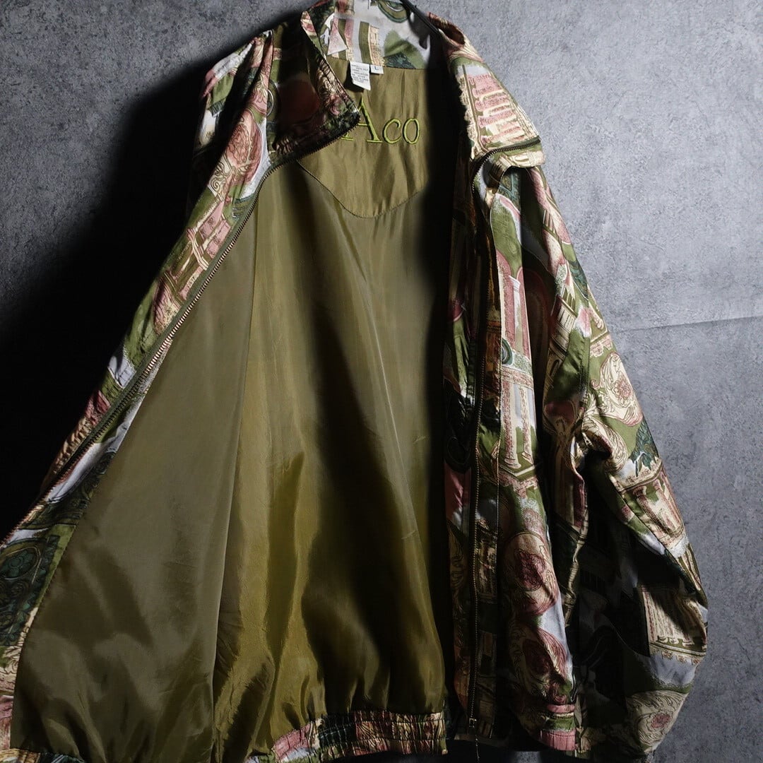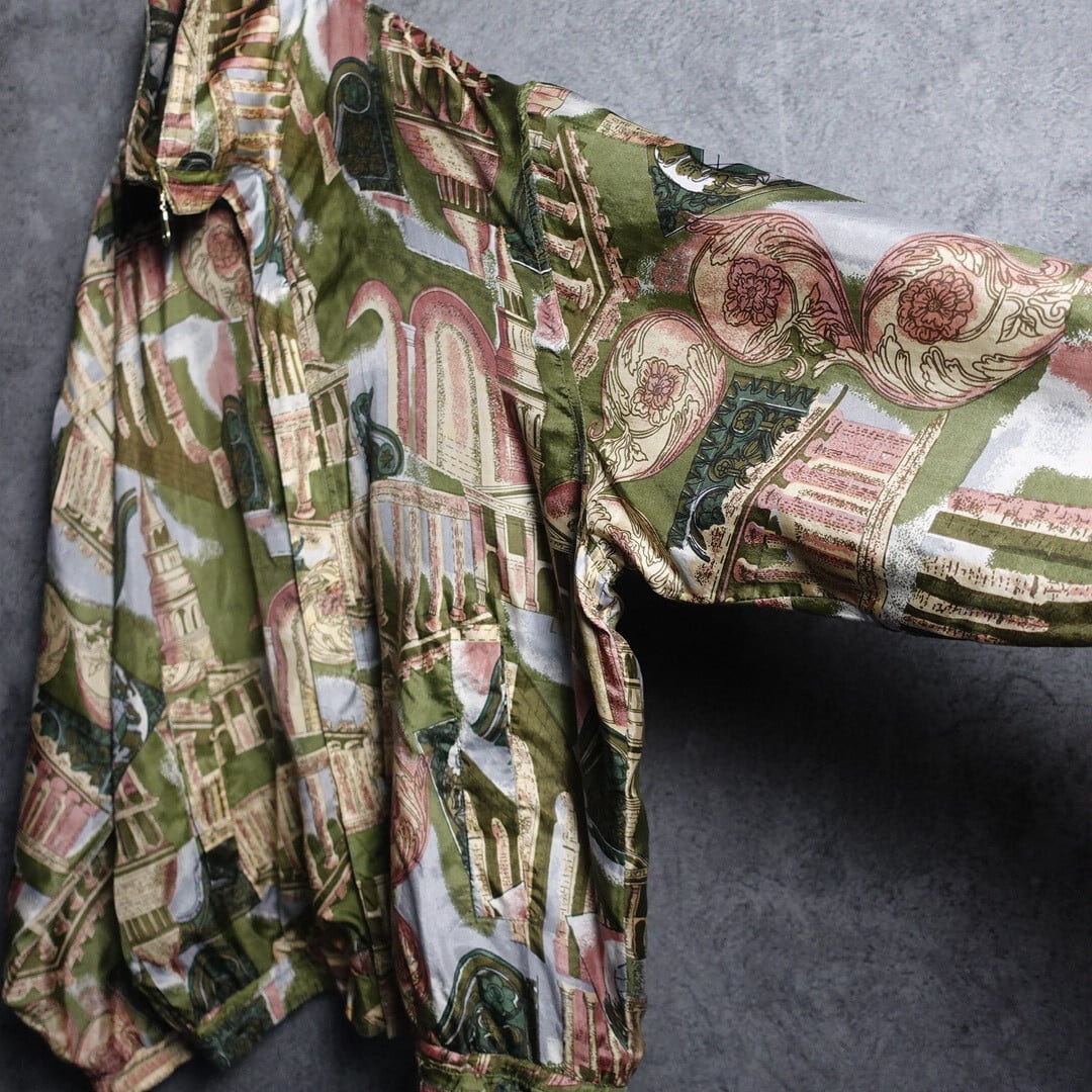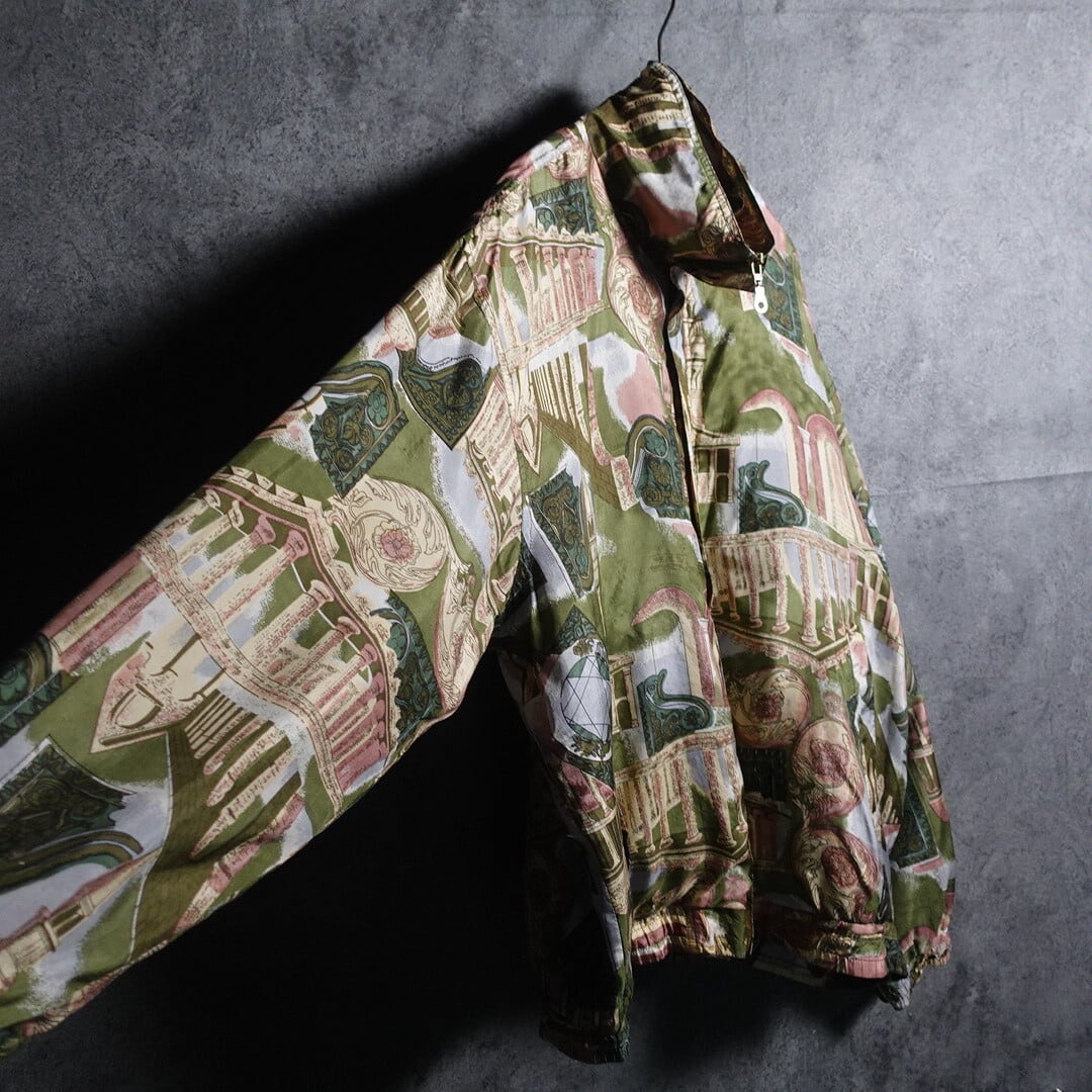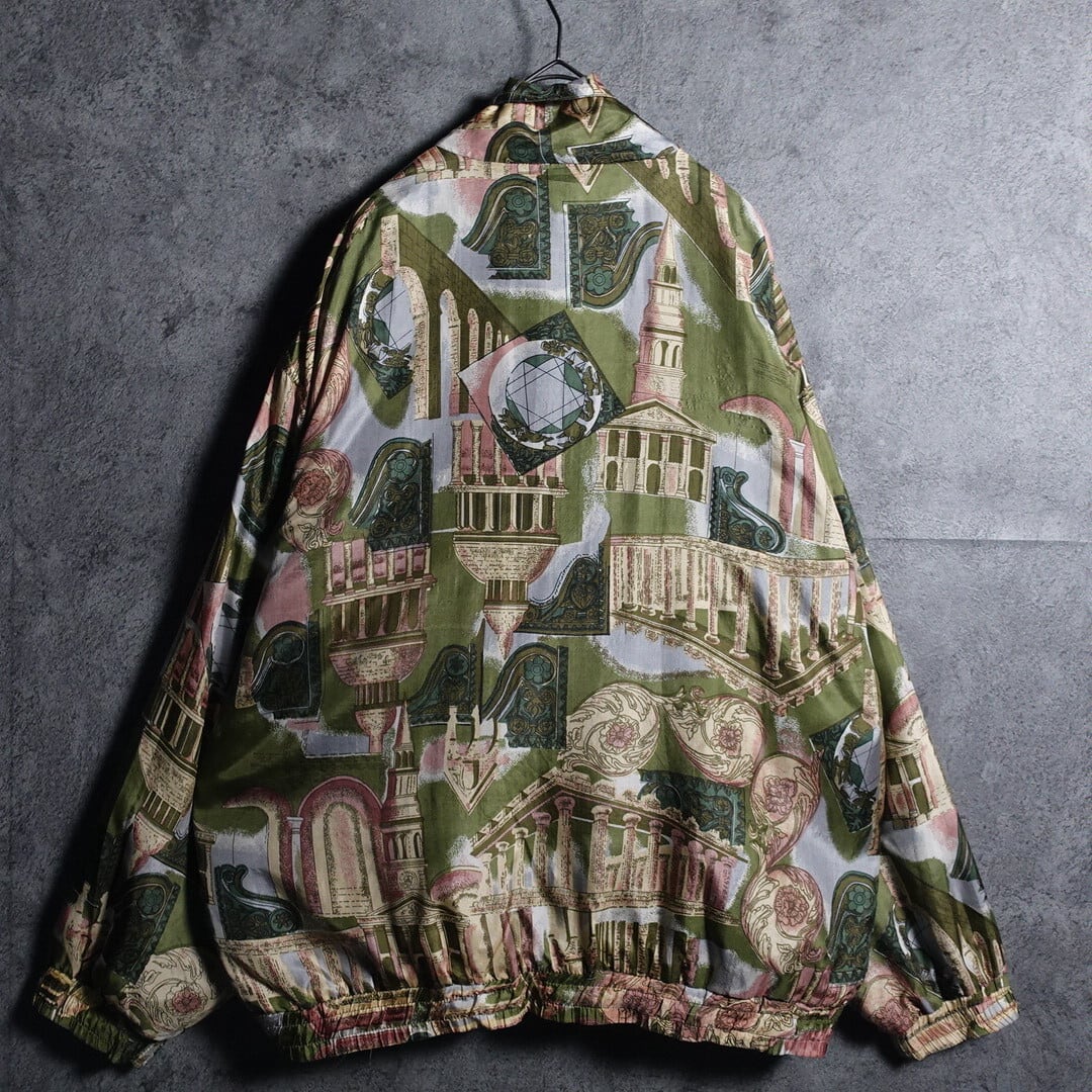 神殿や幾何学的なモチーフを全面にバラバラにあしらったアーティスティックなデザイン。