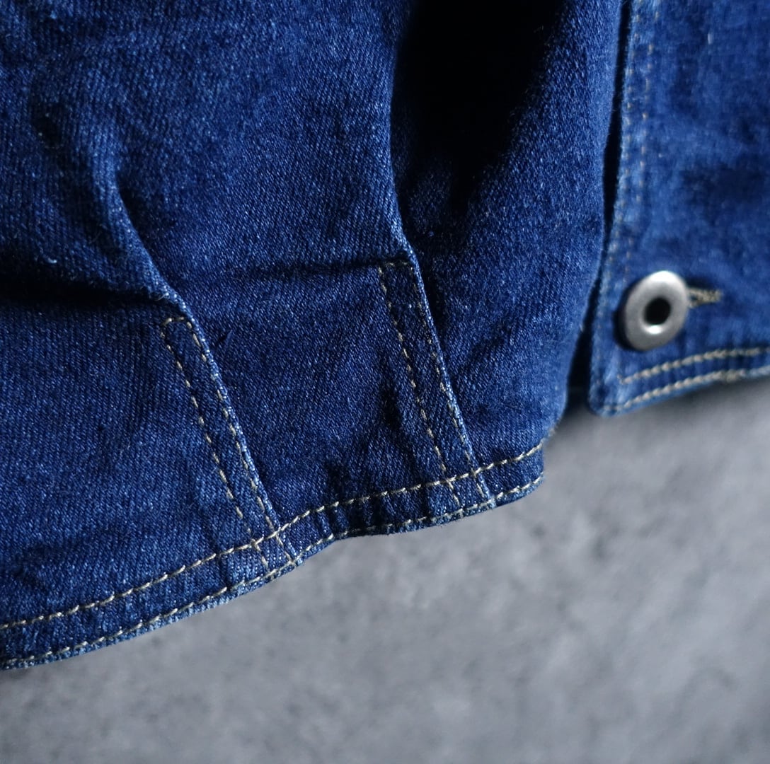 色の残りの良いブルーデニムをベースにジップとボタン付きの比翼を施した変形デザイン。