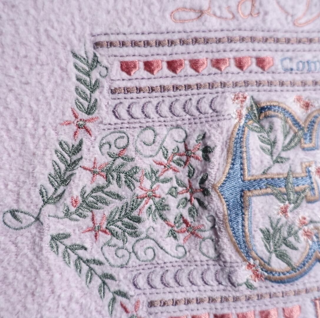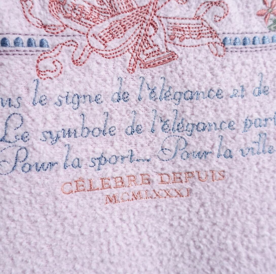 中央にボタニカル、楽器、アルファベットなどの刺繍を施した凝りに凝った豪華な刺繍デザイン。