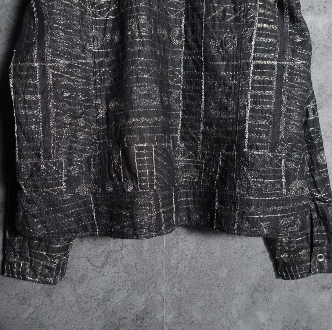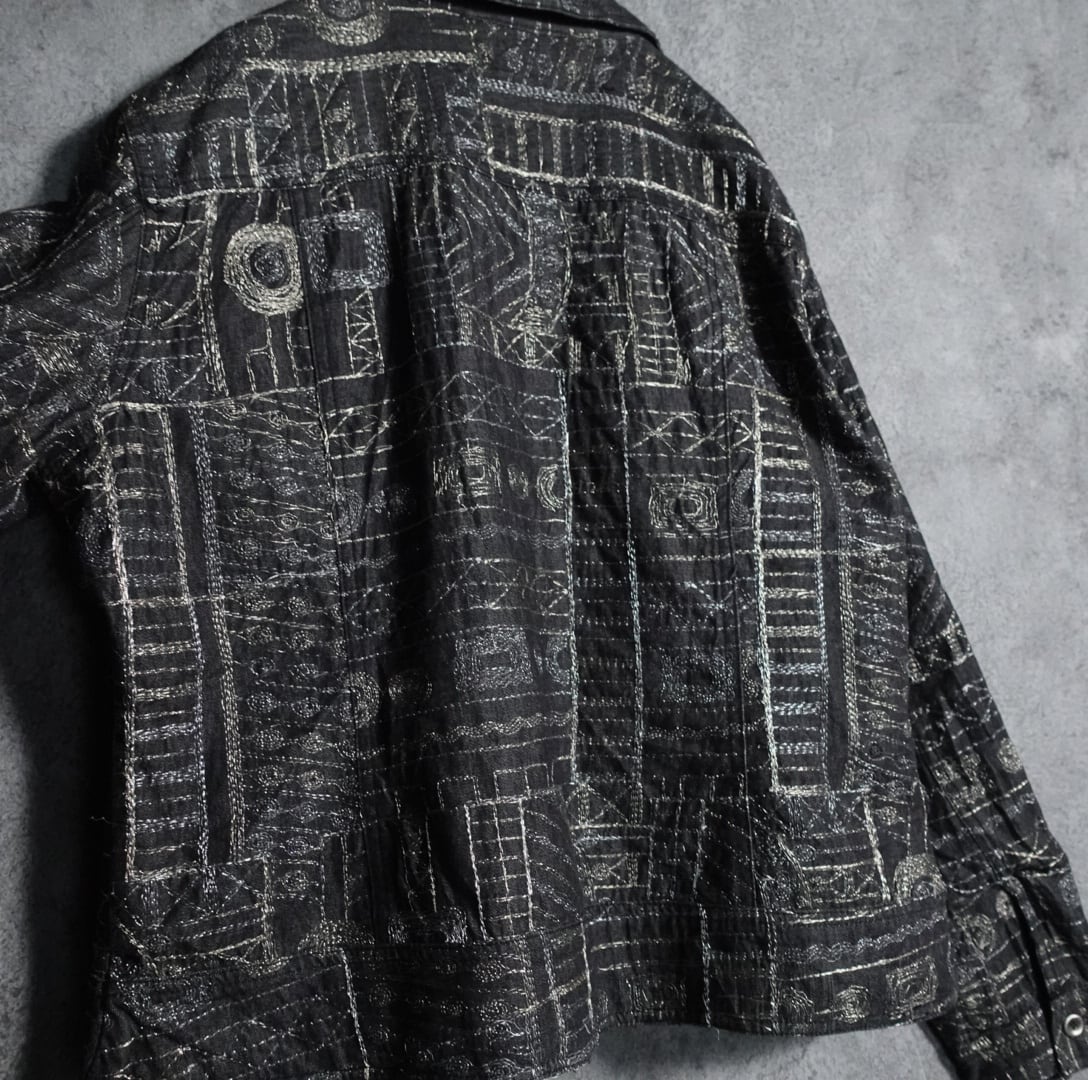 ブラックデニムをベースに幾何学模様をゴールドとシルバーの光沢感のある刺繍糸で表現し全面にあしらった凝りに凝ったアーティスティックなデザイン。