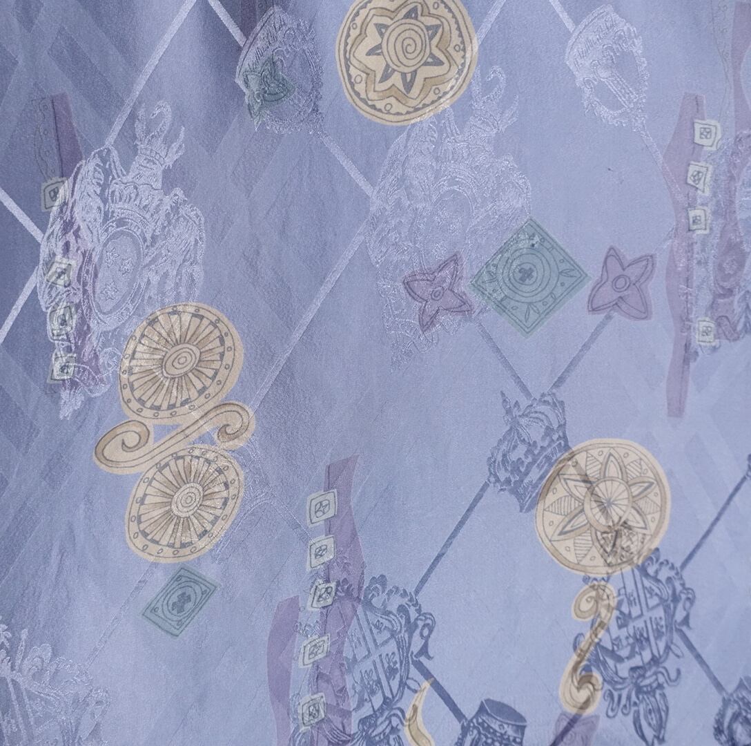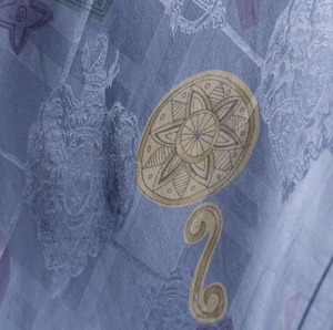 絶妙な色味のブルーグレーをベースに抽象的なモチーフを全面にあしらった洒落たデザイン。
