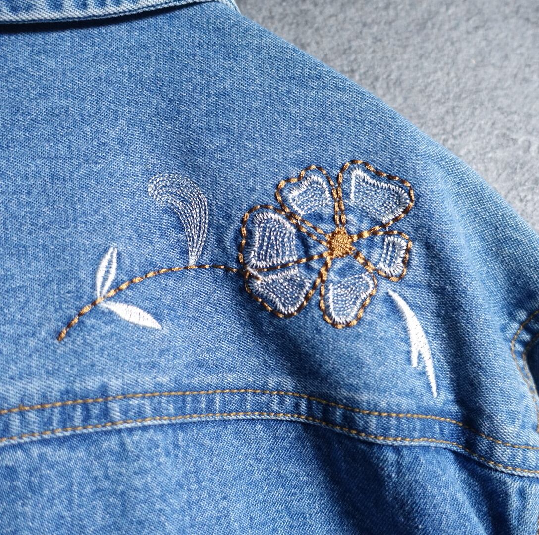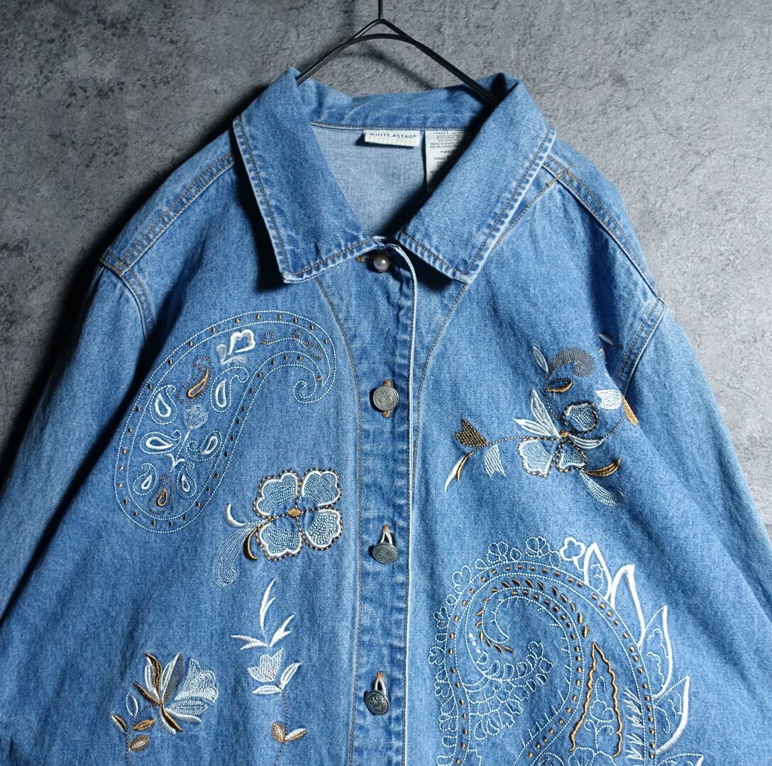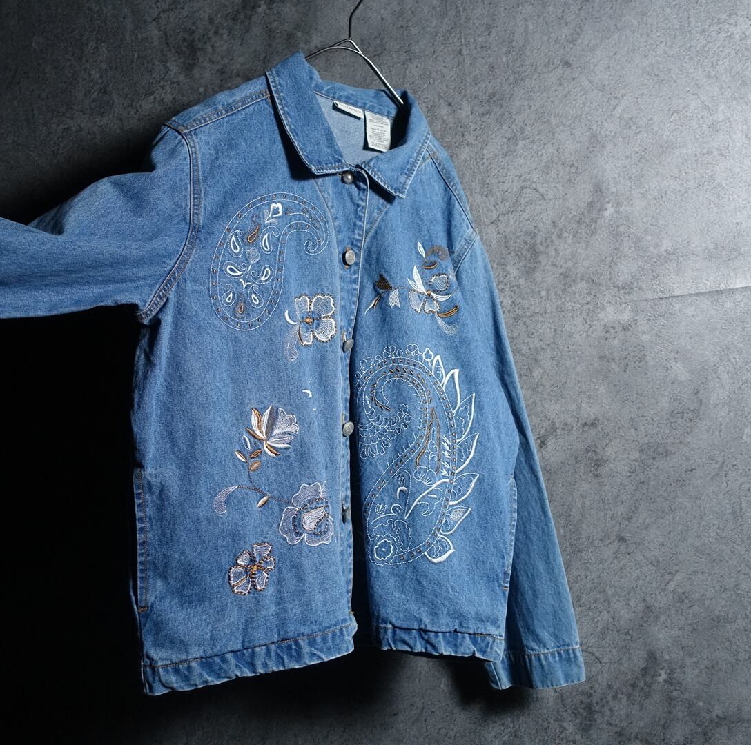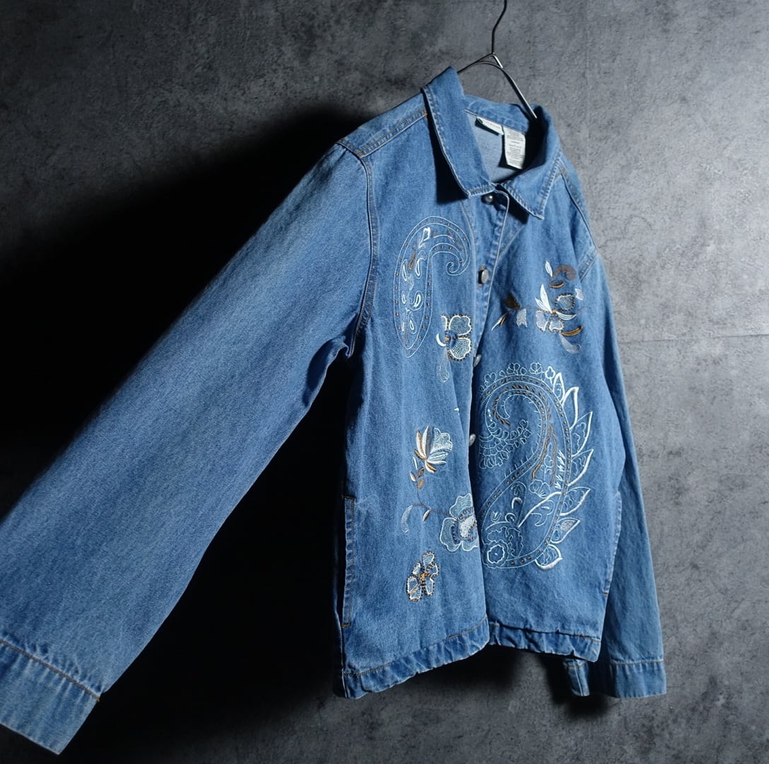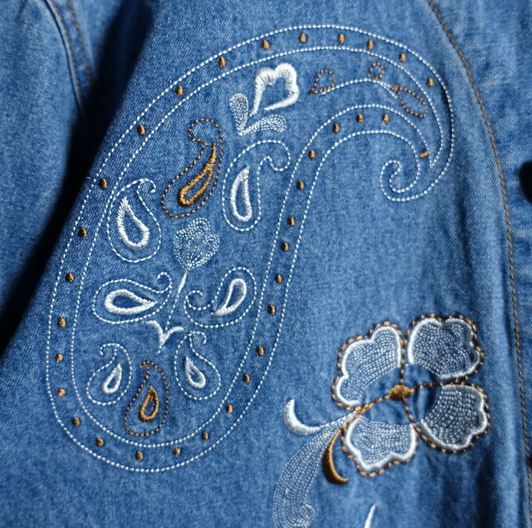 デニムにホワイト、ブラウンのペイズリーと花のモチーフの刺繍を施したデザイン。