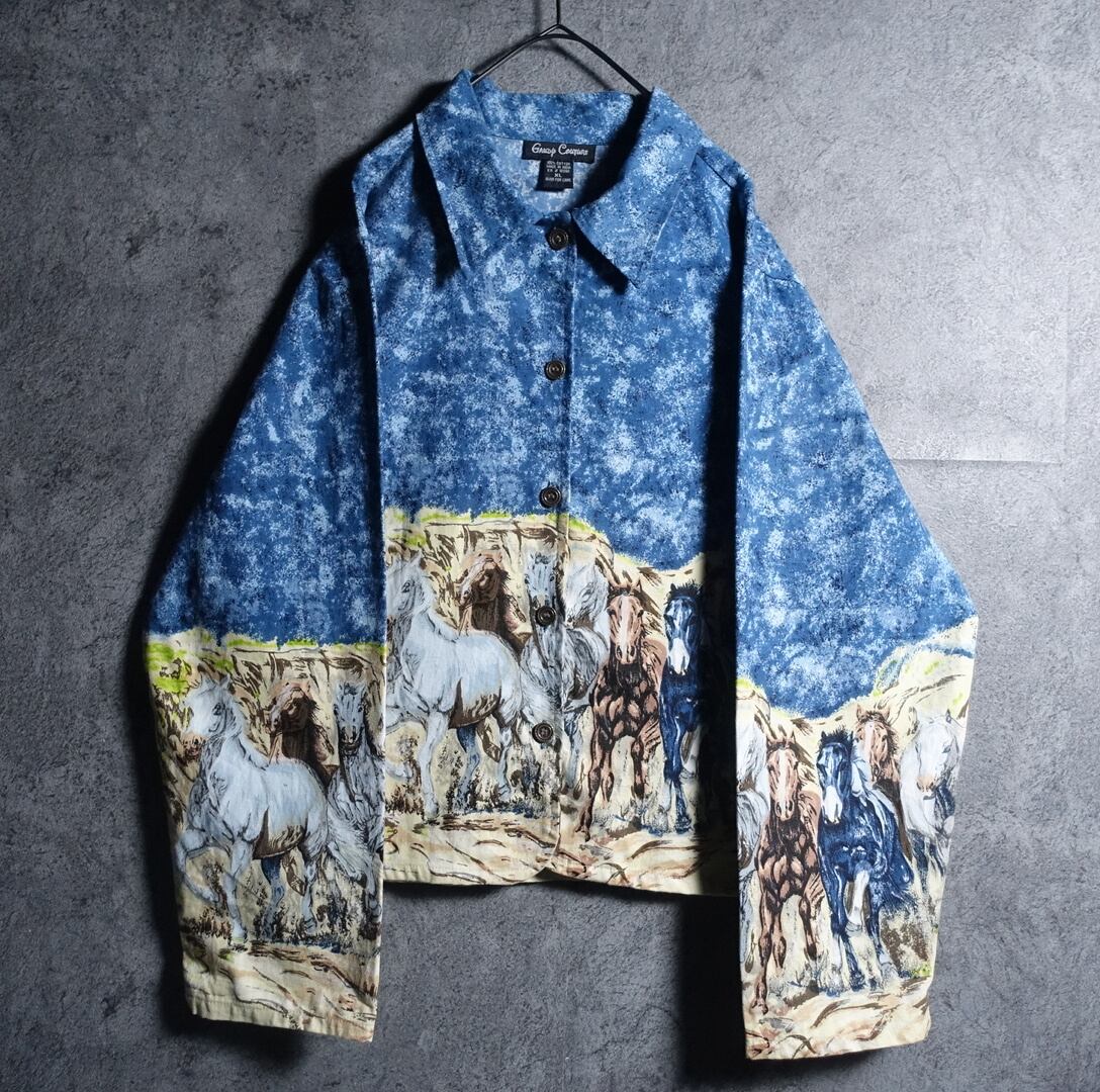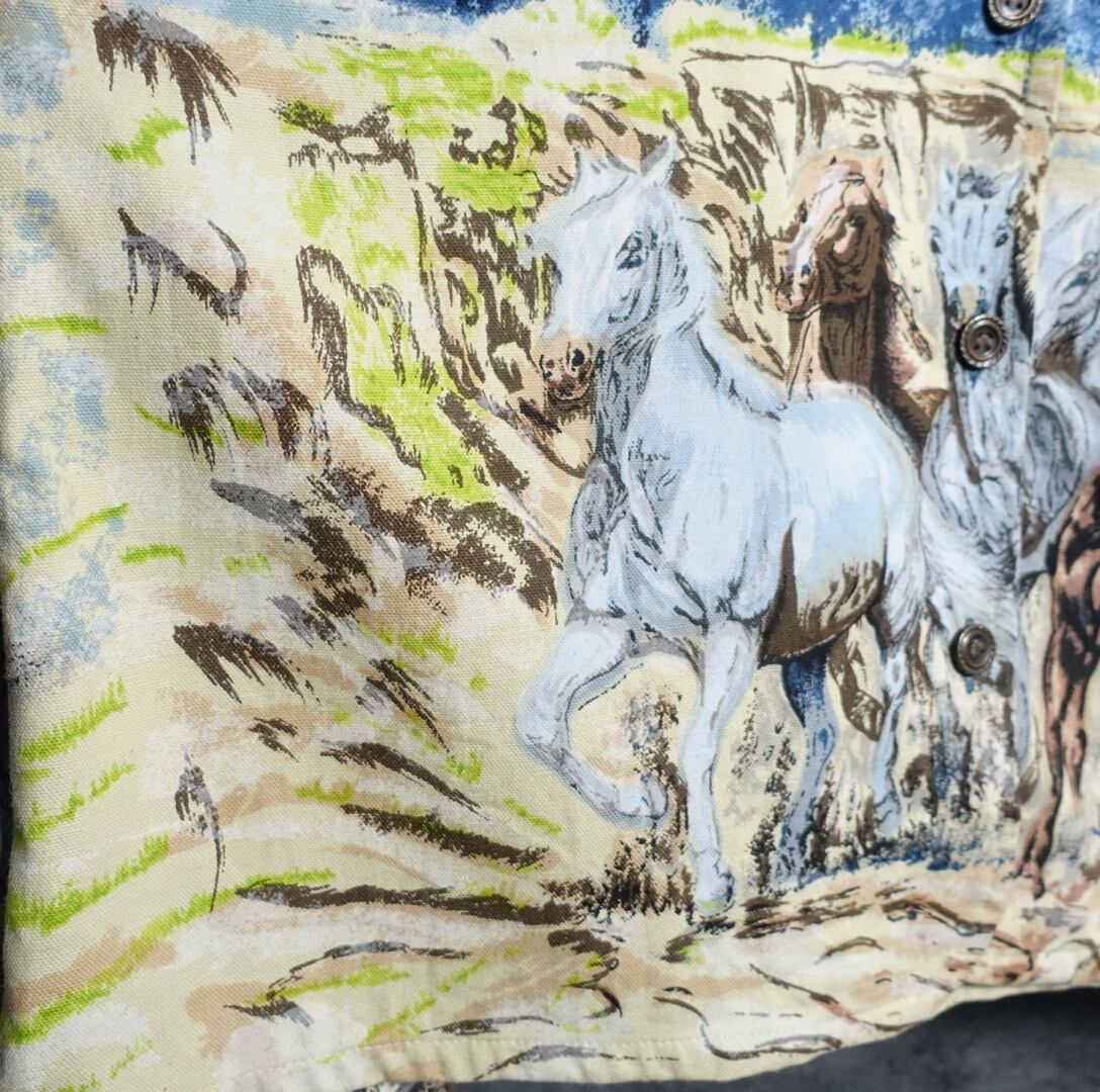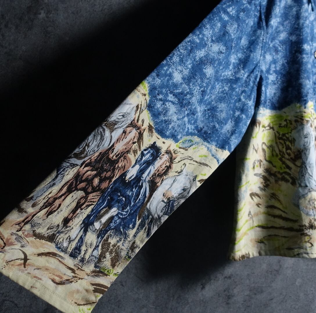 抽象的な柄と馬の群れが走っている風景を全面にあしらったアーティスティックなデザイン。