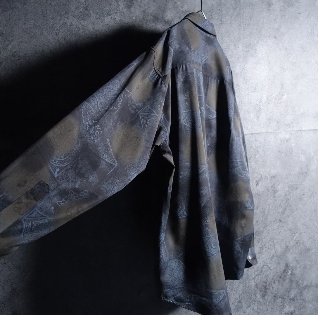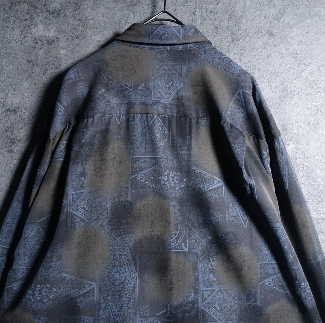 チャコールグレーをベースにブルーグレーの様々な幾何学模様を全面にあしらったデザイン。
