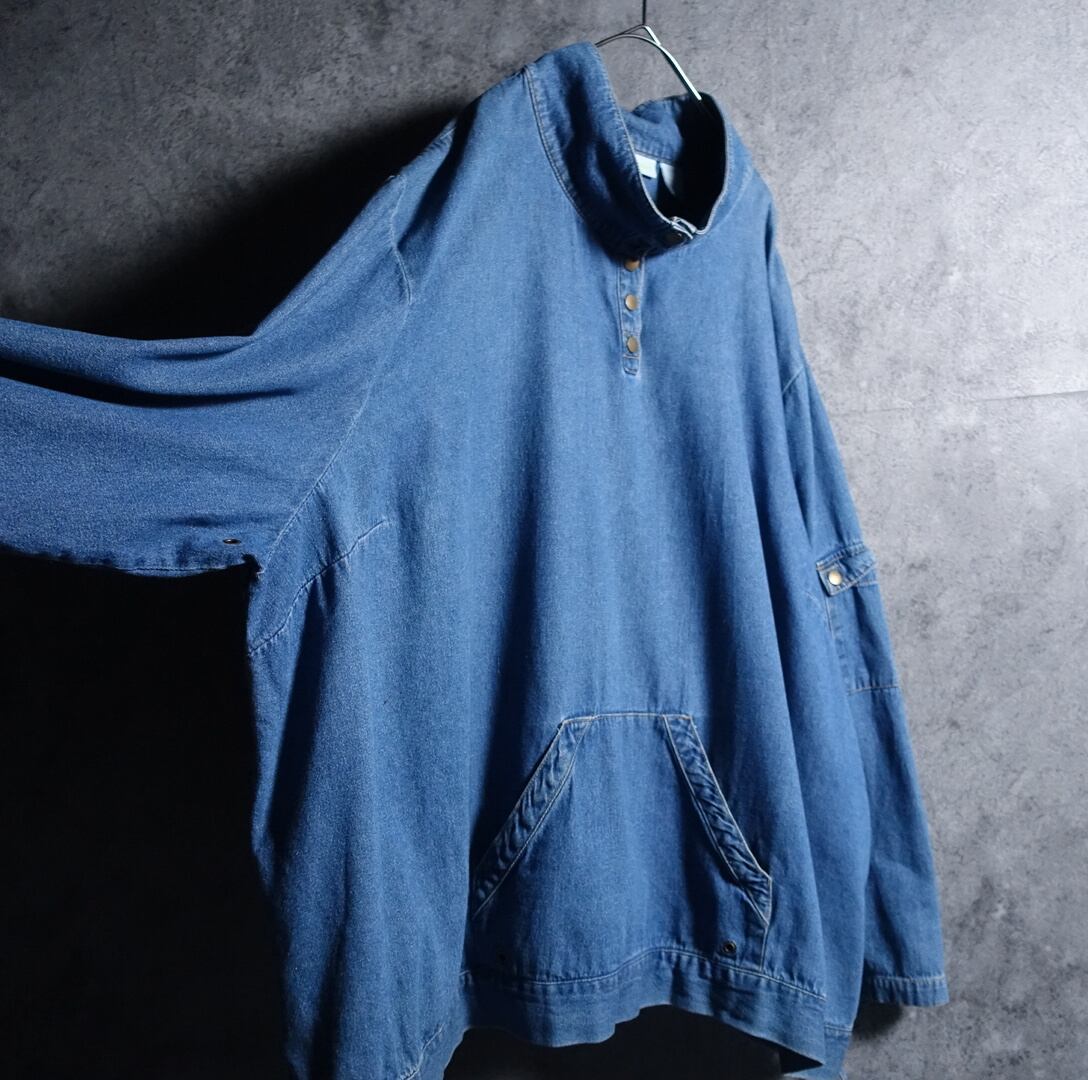 デニムをベースにハーフボタンとカンガルーポケットを施したありそうでないない珍しいデザイン。