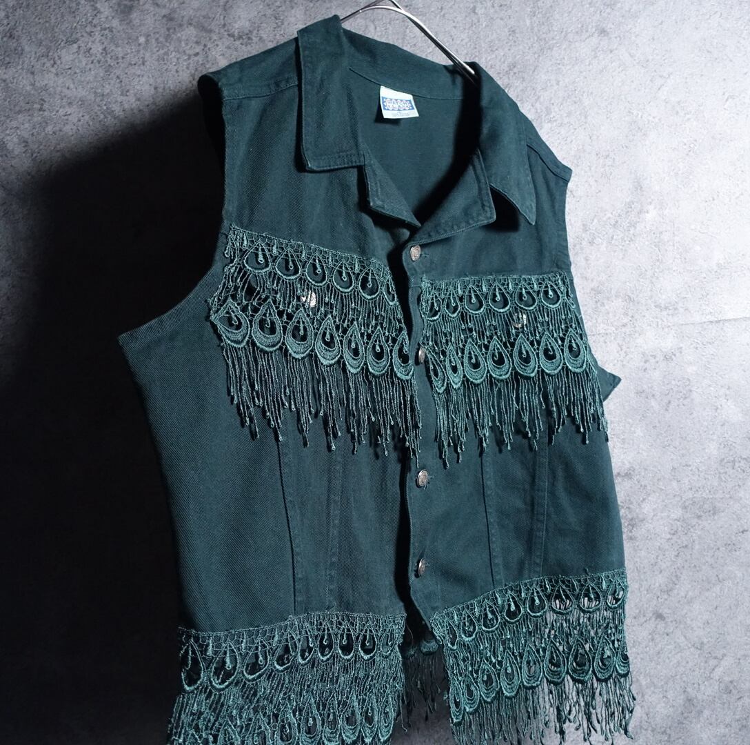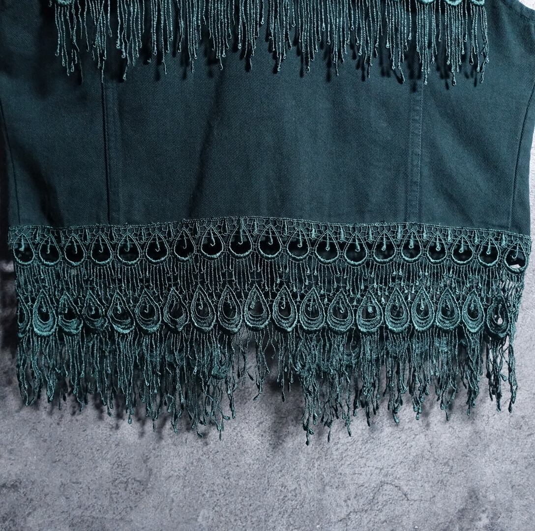 Green Fringe Design Denim Vest