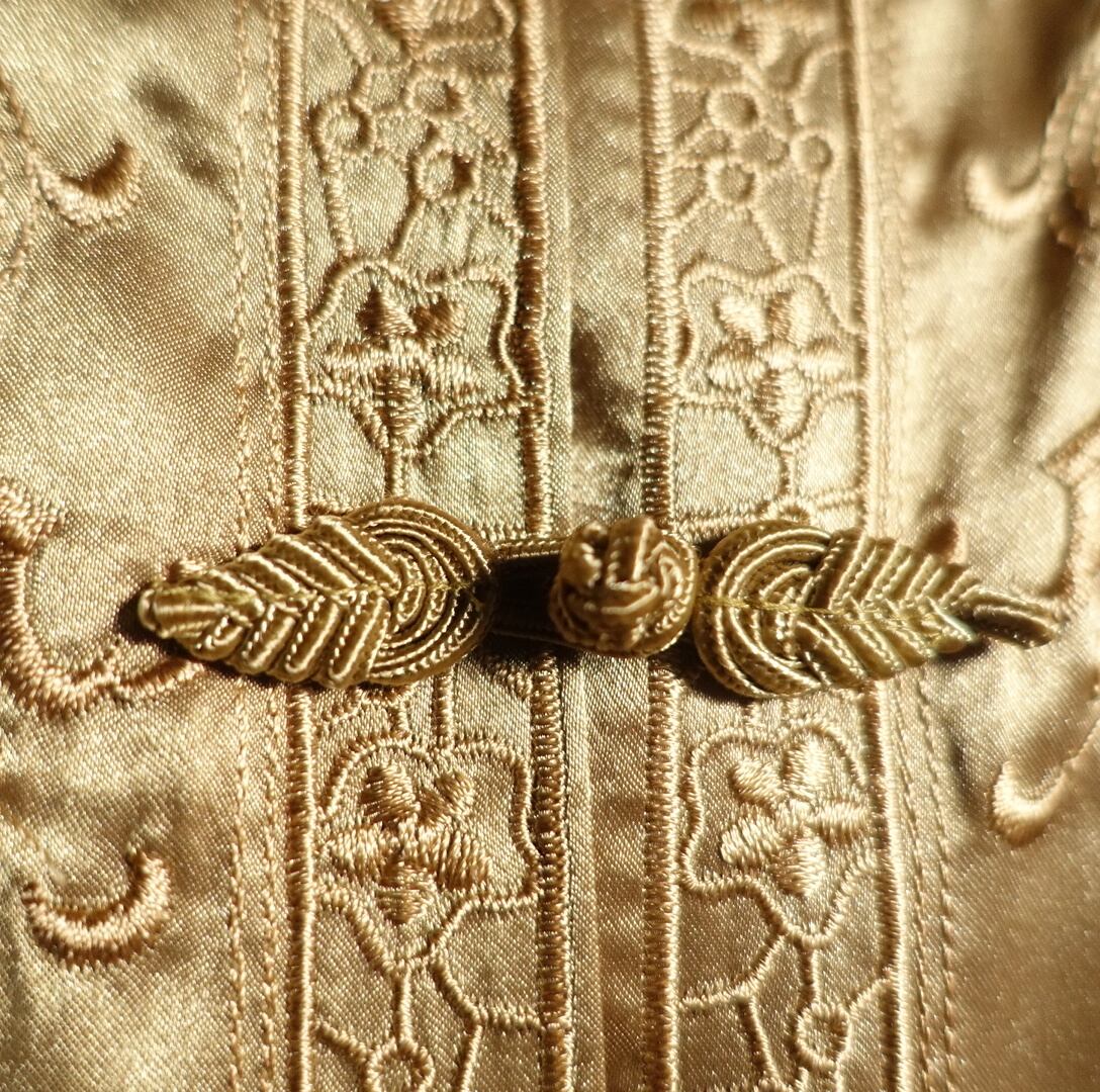 襟の周りにボタニカル調の刺繍を同色のゴールドで施した洒落たデザイン。