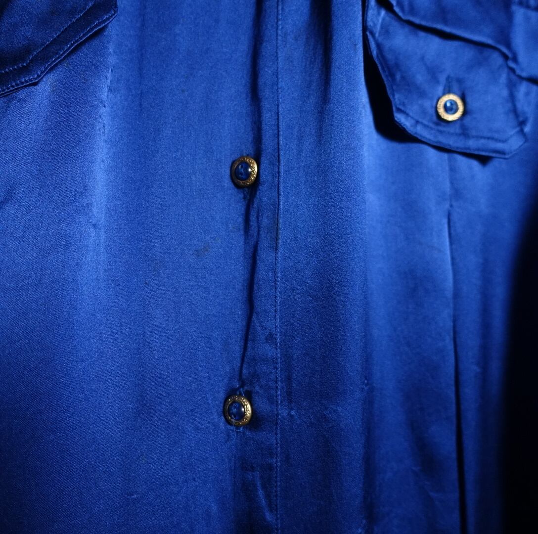 ブルーの刺繍デザインサテンシャツが入荷です。