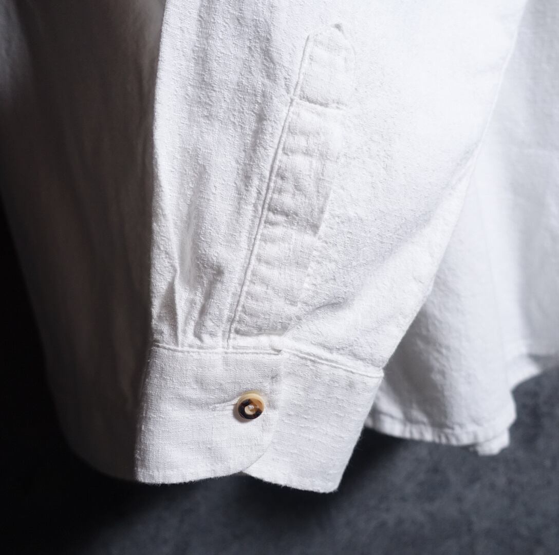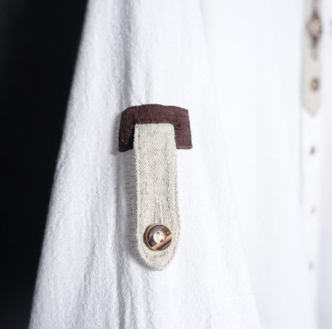 両袖にベルトと内側にボタンが施されていて半袖の長さに調整が可能なため、今の季節から夏まで気温に合わせてお使いいただけます。