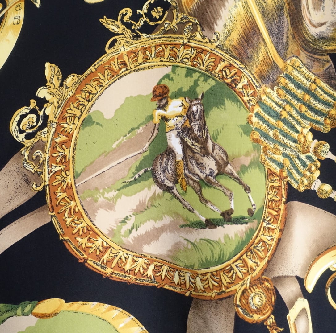 オーナメントと馬のモチーフ、キツネと乗馬の風景画をあしらったラグジュアリーなデザイン。