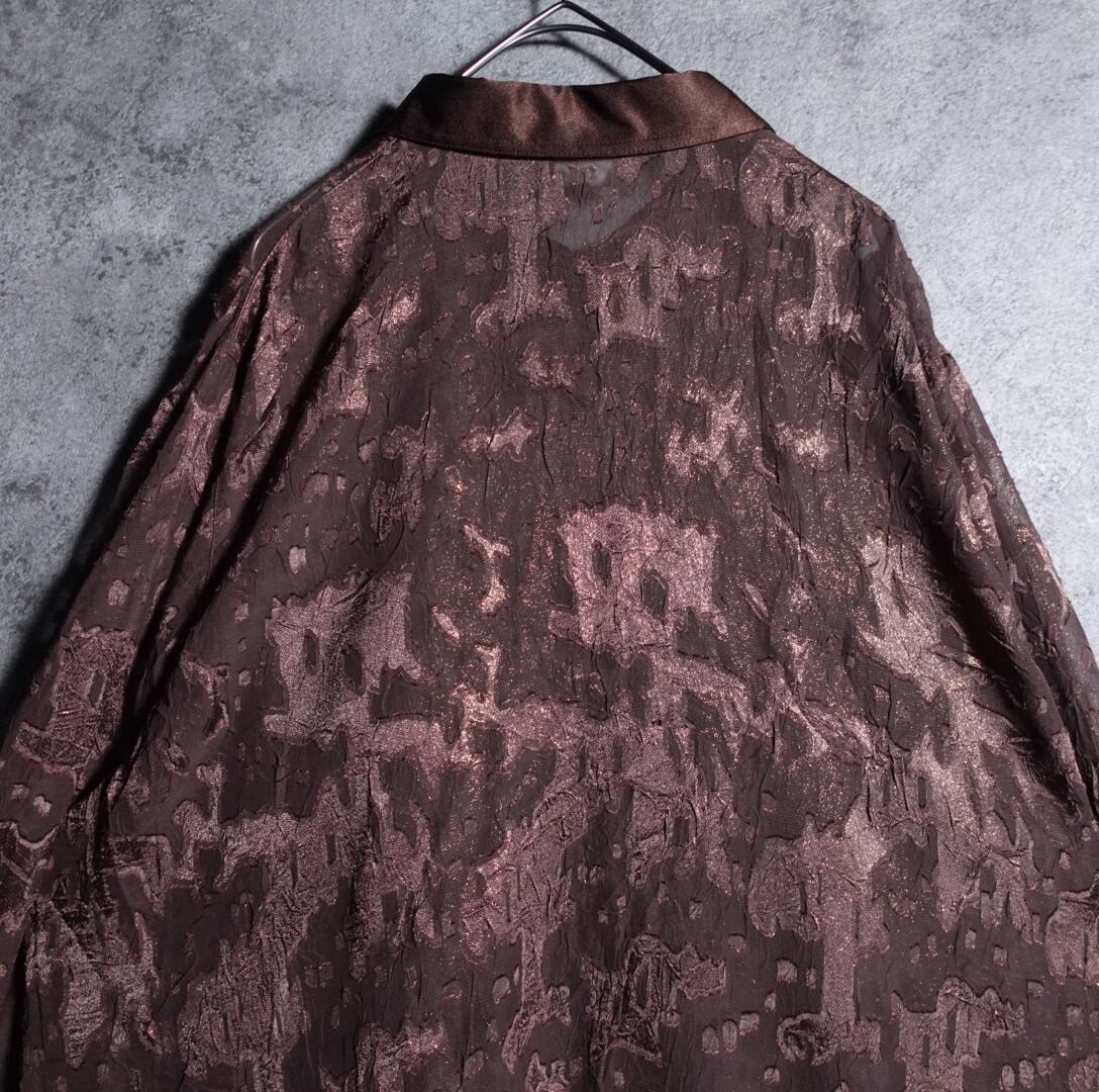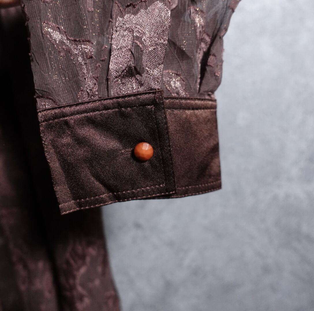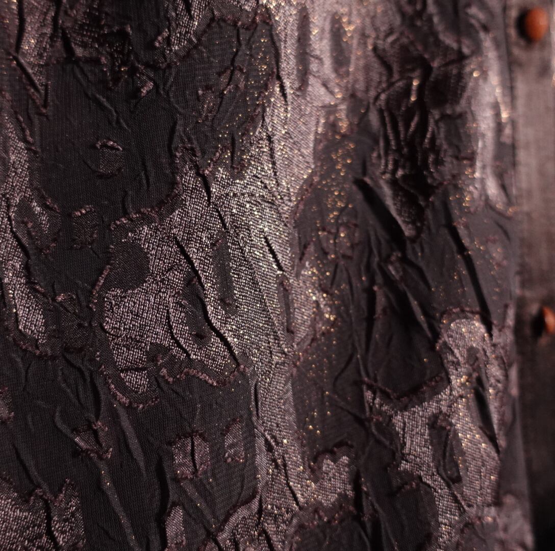 秋らしいブラウンのシアー生地に更に抽象的な柄を表現した生地とラメを全面に施した凝りに凝ったデザイン。