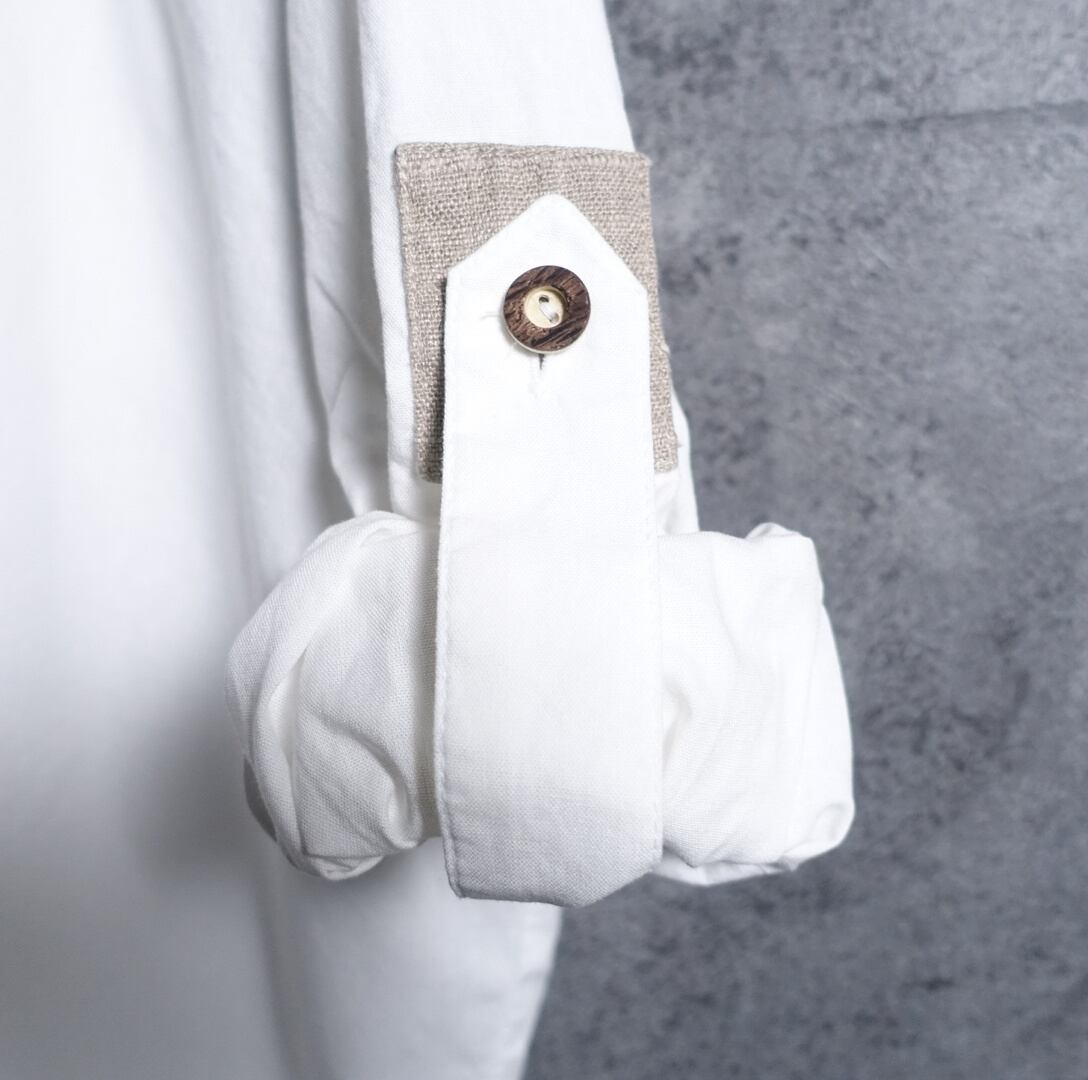両袖にベルトと内側にボタンが施されていて半袖の長さに調整が可能なため、今の季節から夏まで気温に合わせてお使いいただけます。