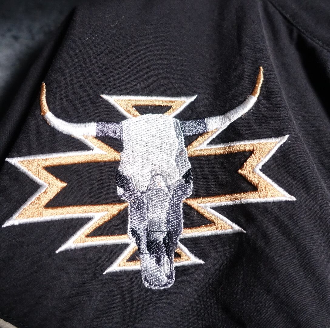両肩にバイソンスカルのモチーフを刺繍で施したデザイン。